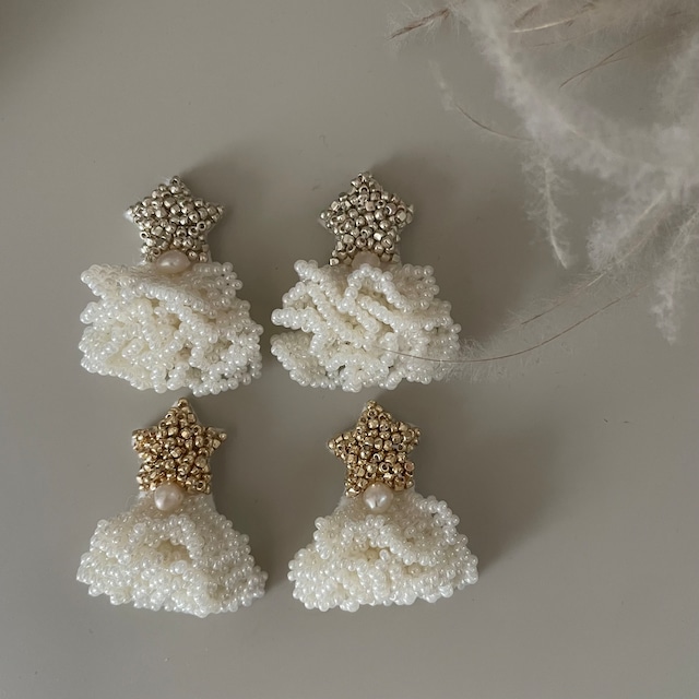 holiday design ツリーをイメージしたデザイン ゴールドの星にパールのフリル、小さな淡水パールが上品なデザインです。 キレイめスタイルにも、カジュアルにスウェットやニット、デニムなどに合わせていただいても間違いないオールシーズンお使いいただけるアイテムです。 ゴールドのみ。 ピアス:サージカルステンレス イヤリング:サージカルステンレス(ネジバネタイプ) サイズ:約3.5㎝×3㎝ 素材:PFゴールドビーズ(通常のビーズに比べて、劣化しにくい素材のビーズです)、淡水パール、国産パールビーズ