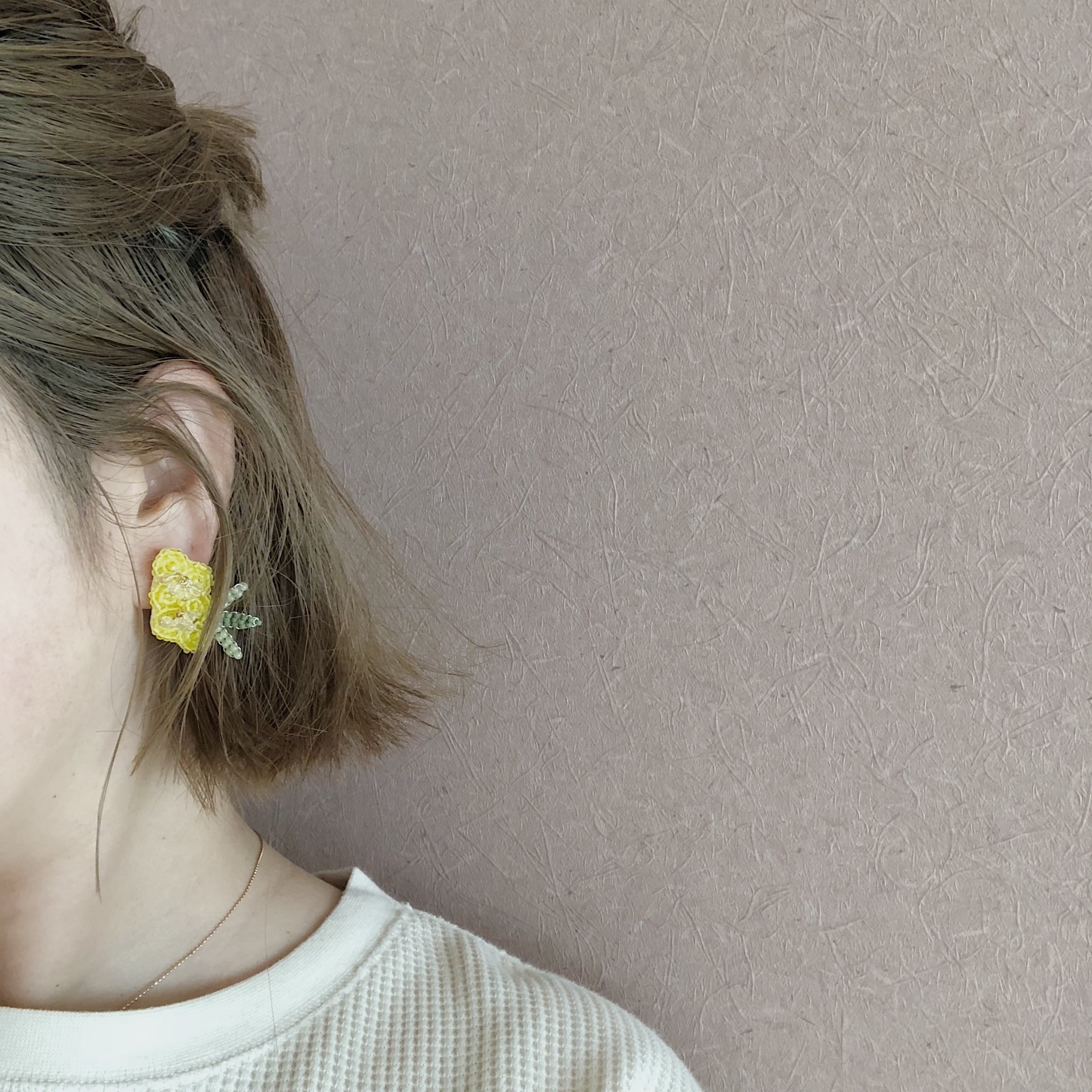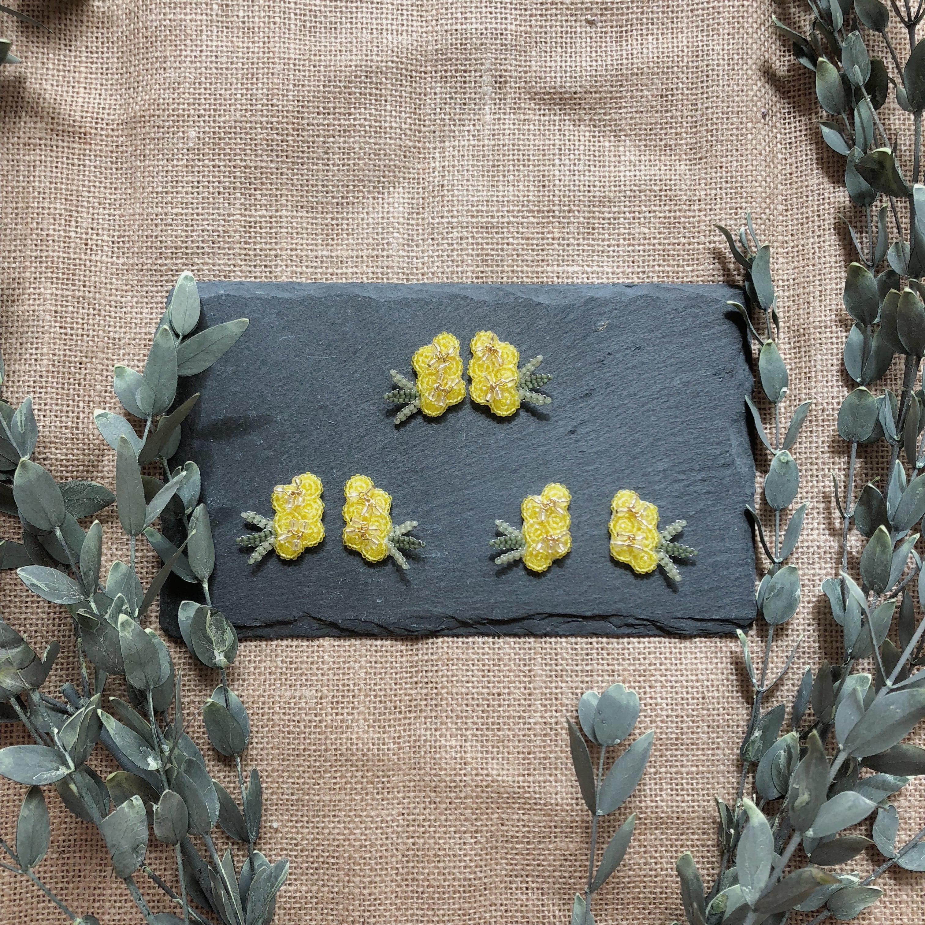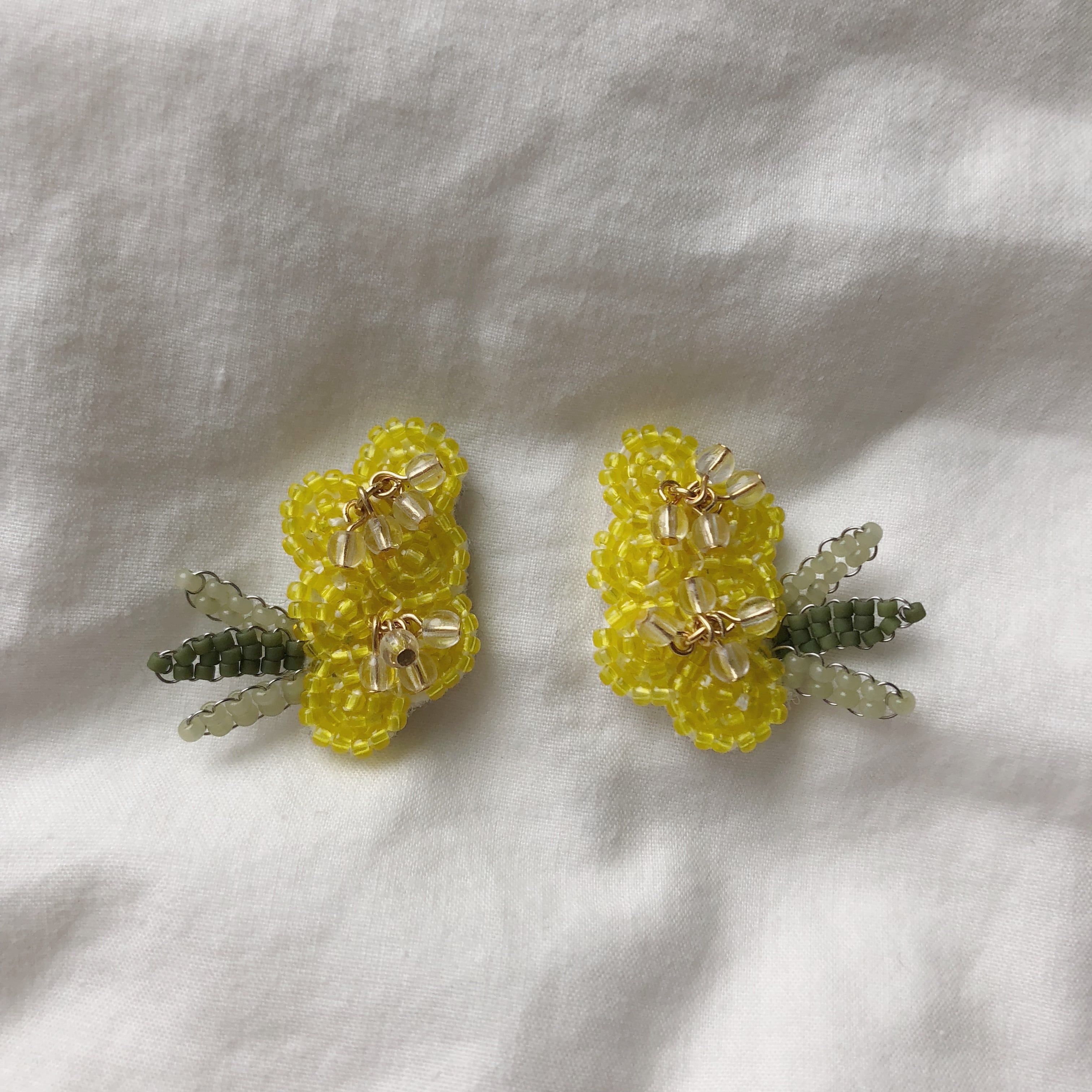 クリアの丸い小さいビーズは、ミモザのつぶつぶした花の部分をイメージしてます。