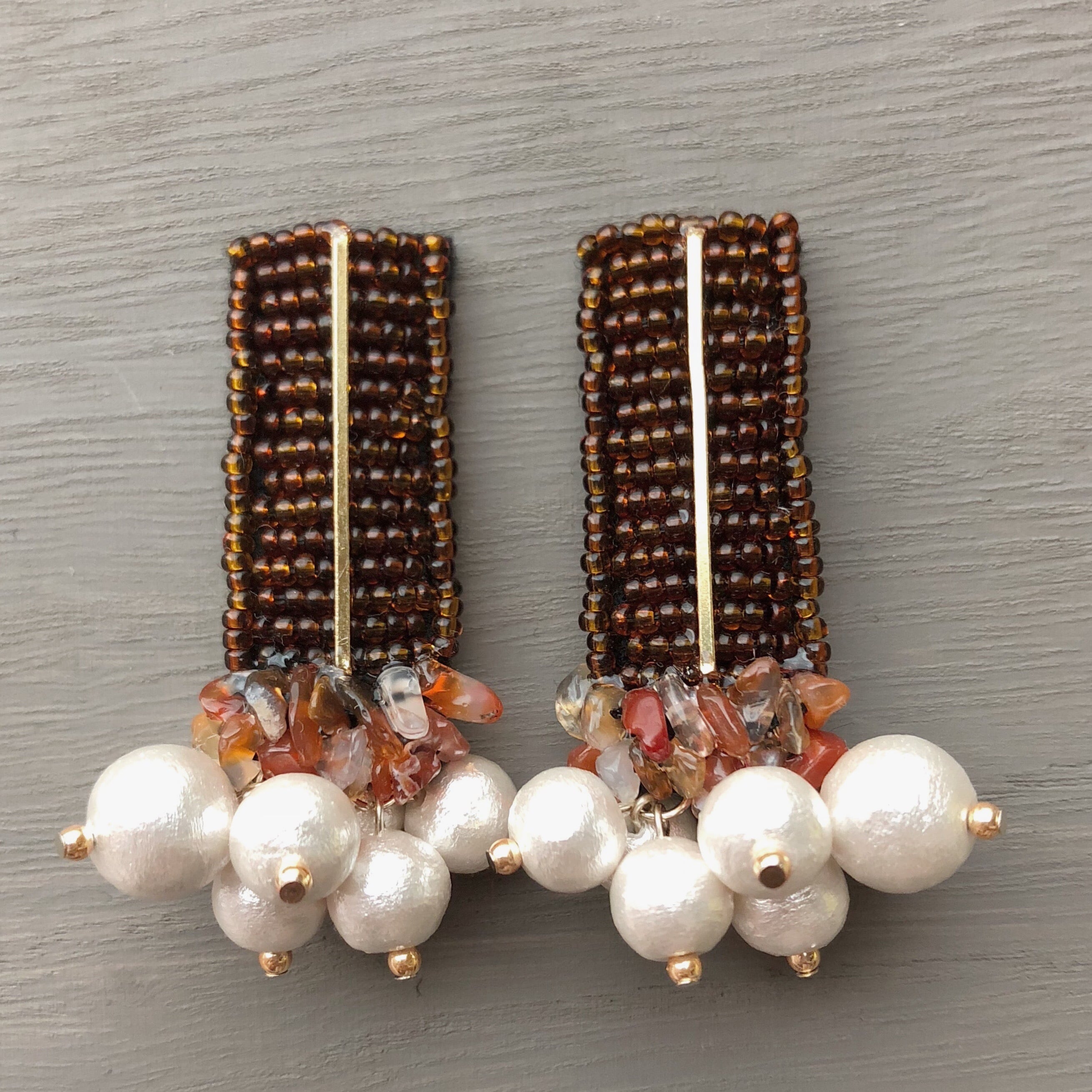 不揃いな天然石とコットンパールで下に重心を置いた雰囲気が、つけた時にかわいいシルエットになります。