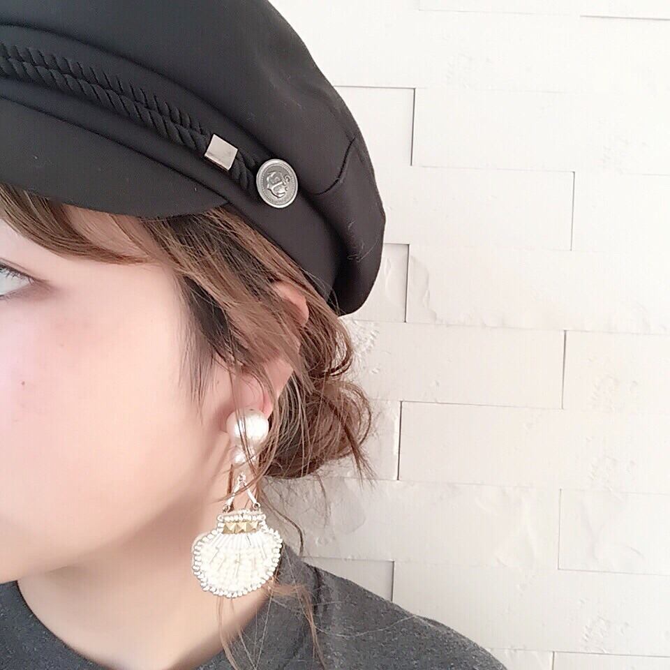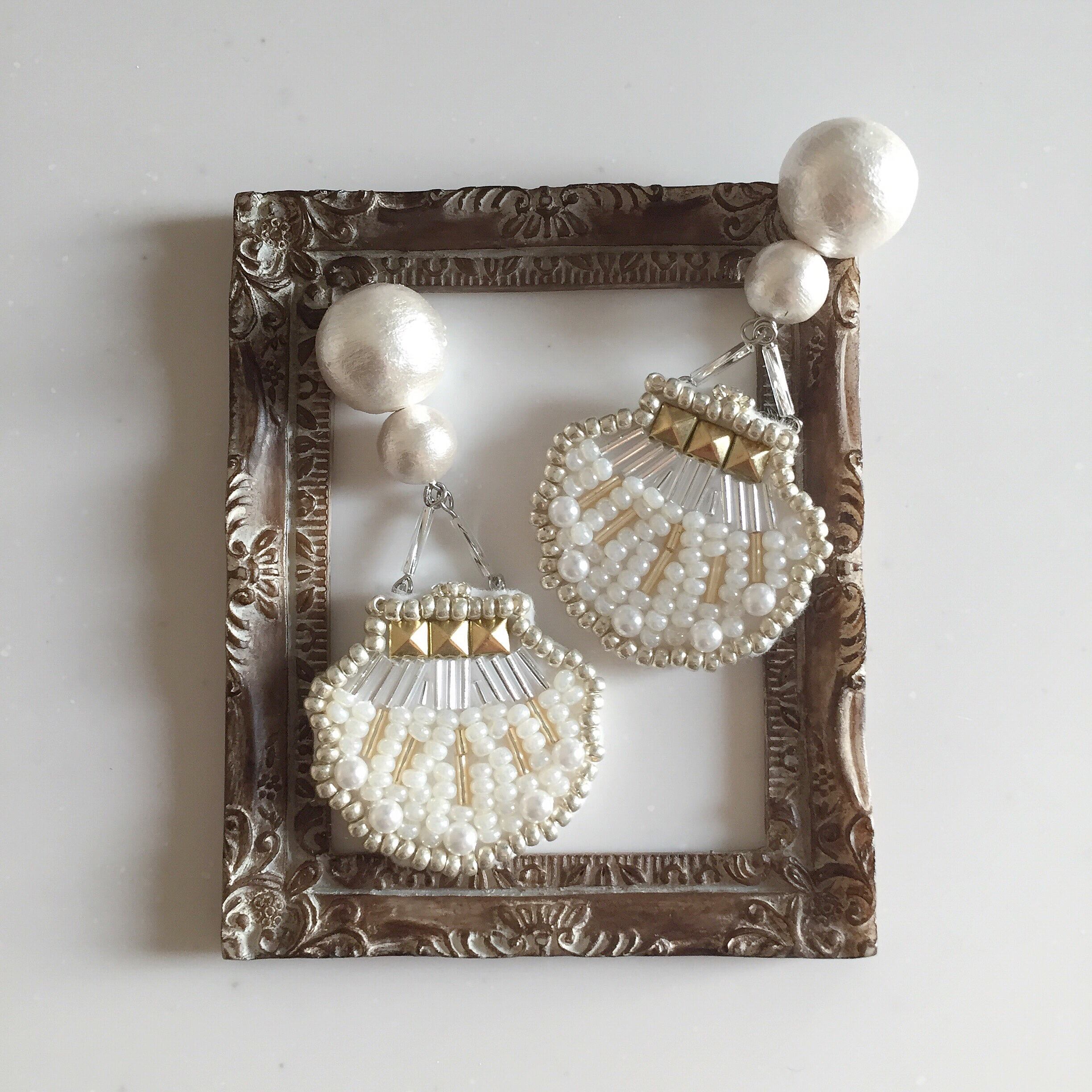 いろんな種類のビーズとパール、スタッズを融合させたシェルモチーフのアクセサリーです。