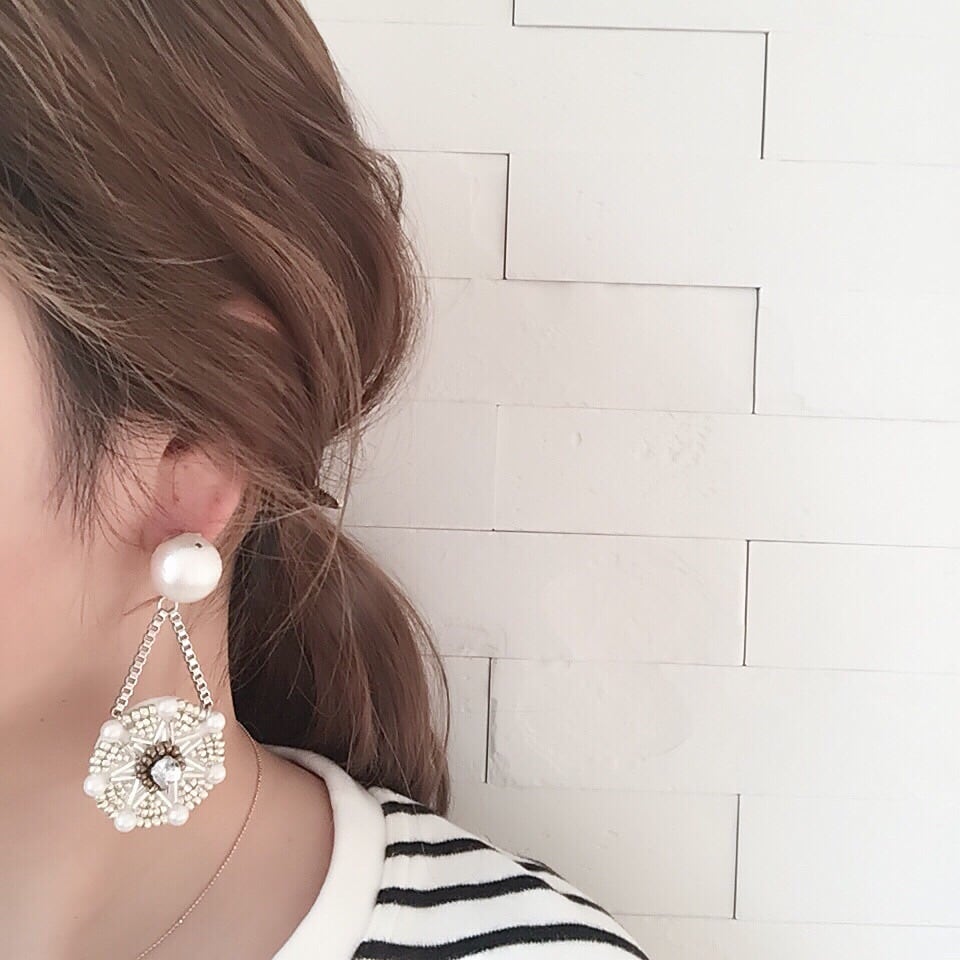 丸いモチーフの中にお花が咲いたようなイメージのアクセサリーです。