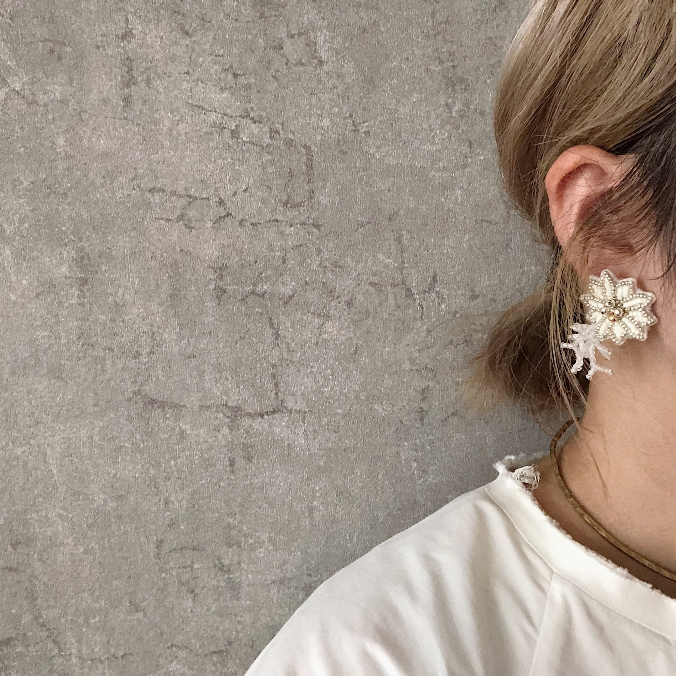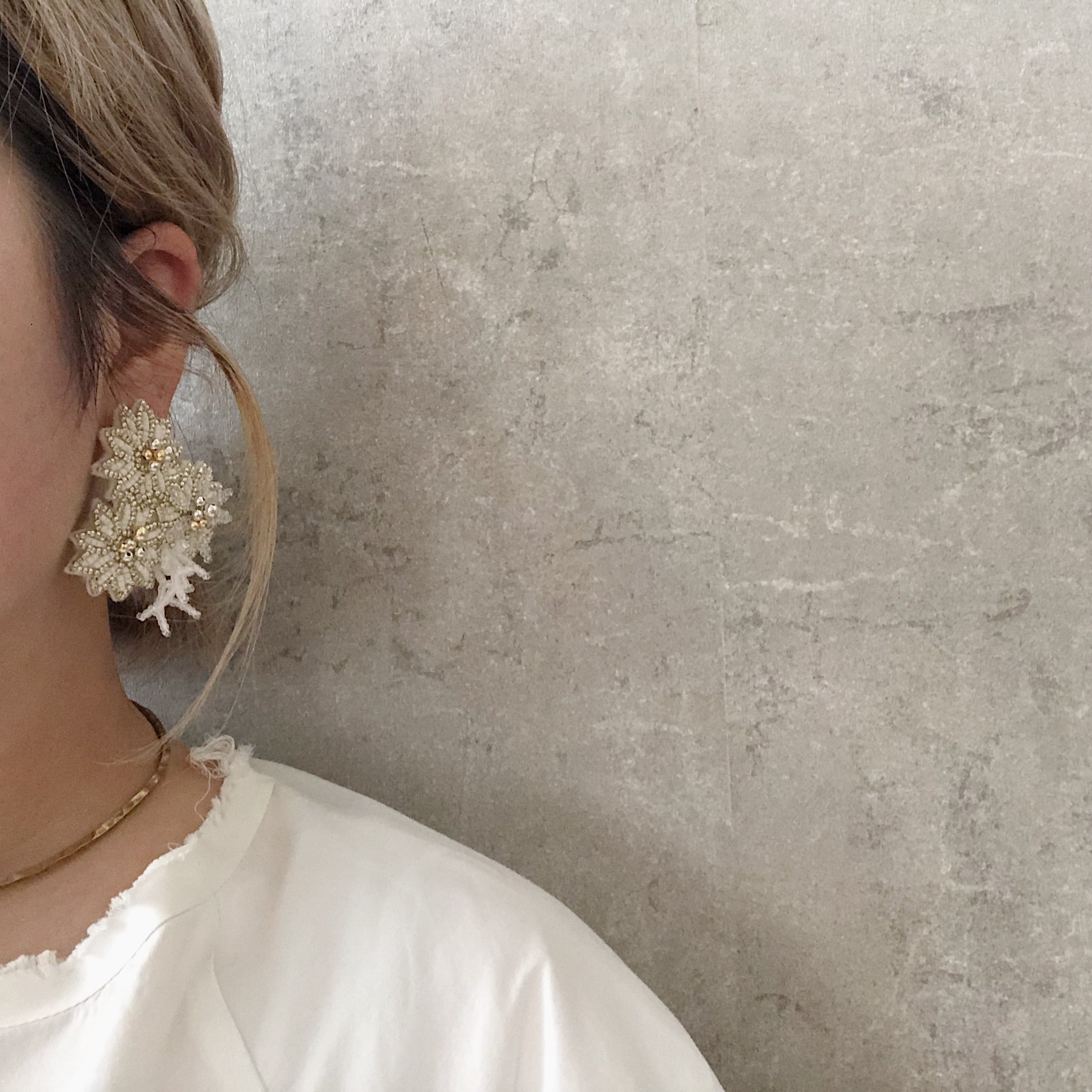 アシンメトリーなデザインで、あえて色味を抑え茎や葉の部分も半透明なビーズで表現しました。