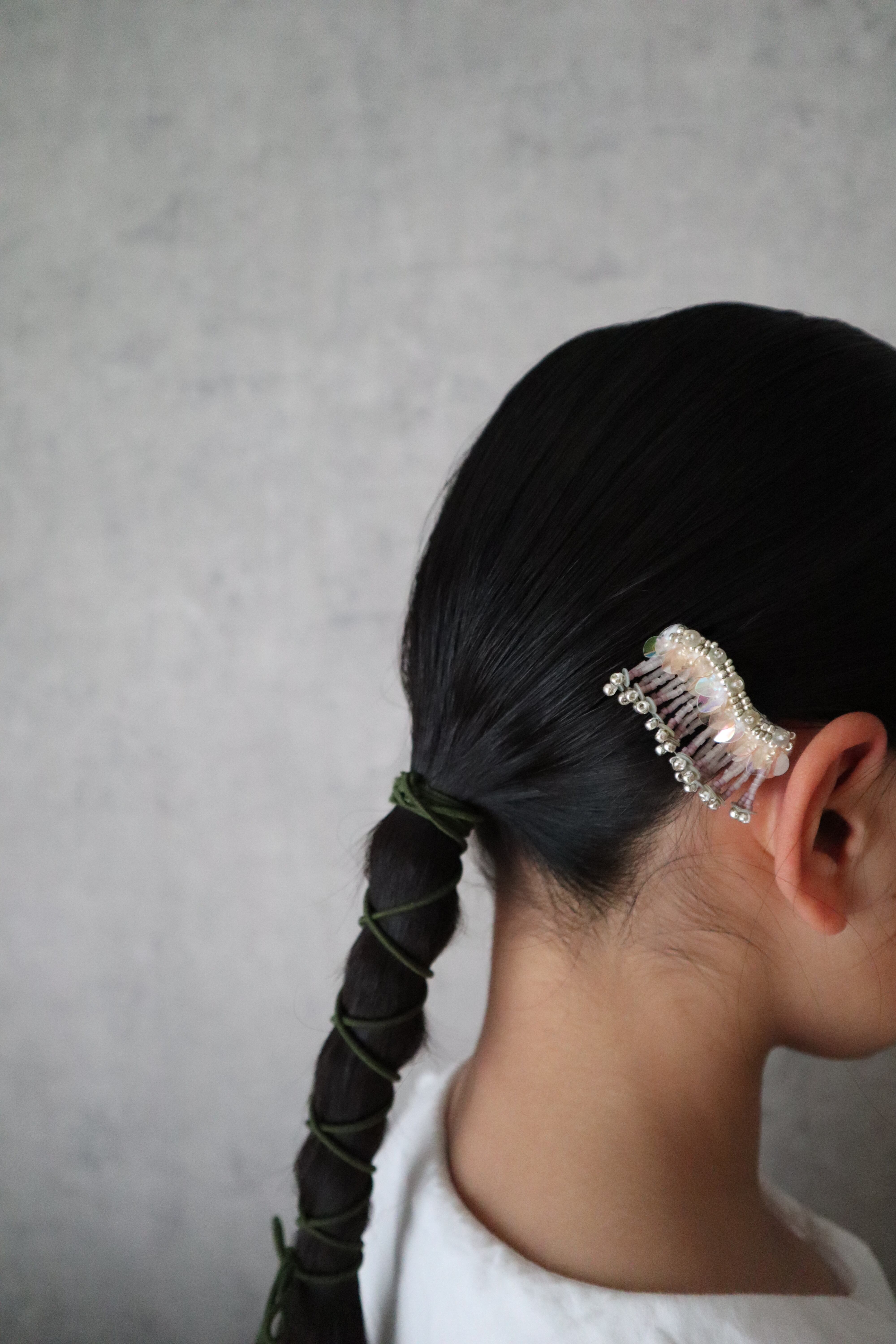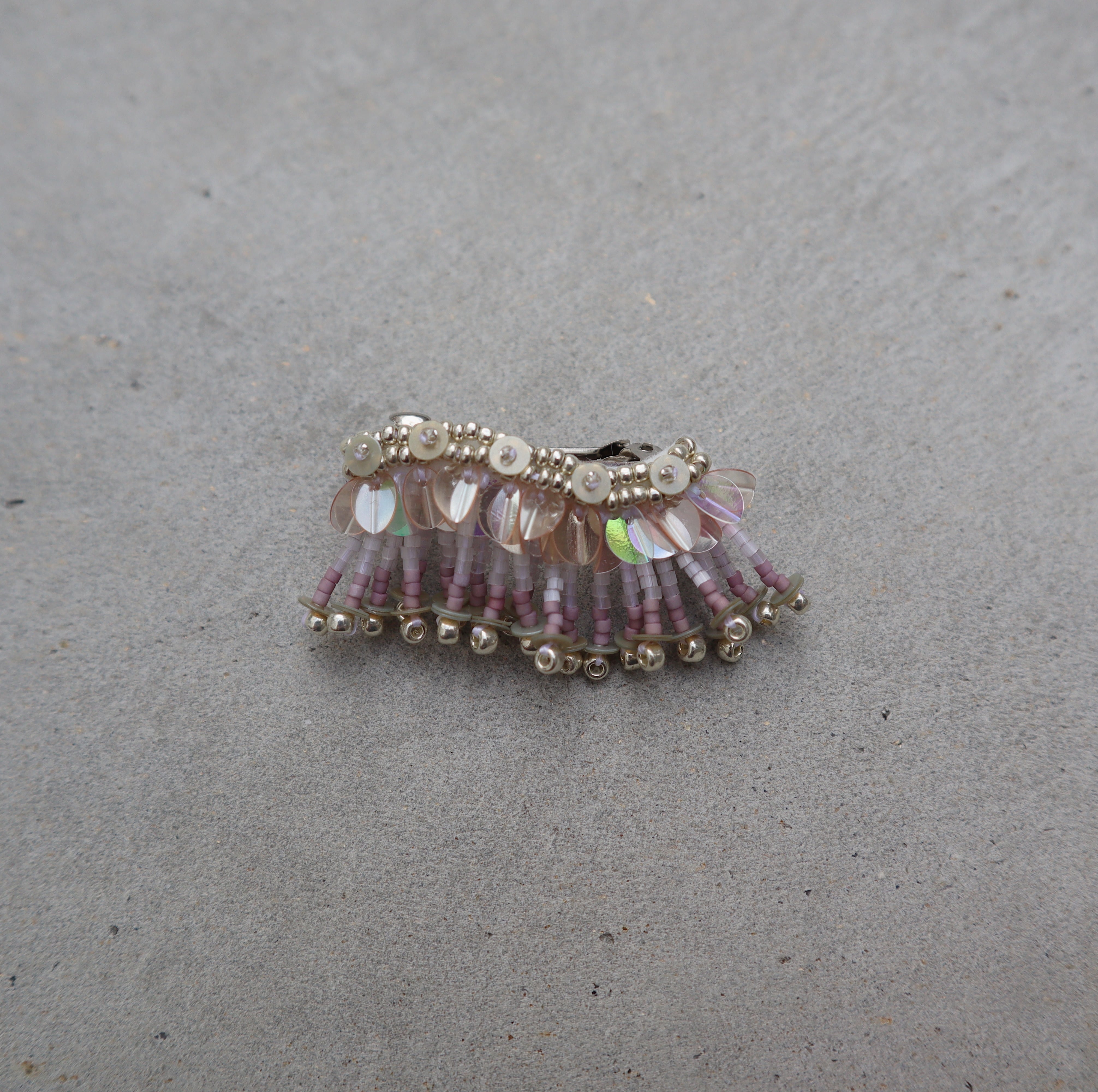 薄いグレーとくすんだパープルのガラスビーズフリンジに、薄いくすみピンクのスパンコールとオーロラのようなスパンコールをmixした華やかなバレッタです。