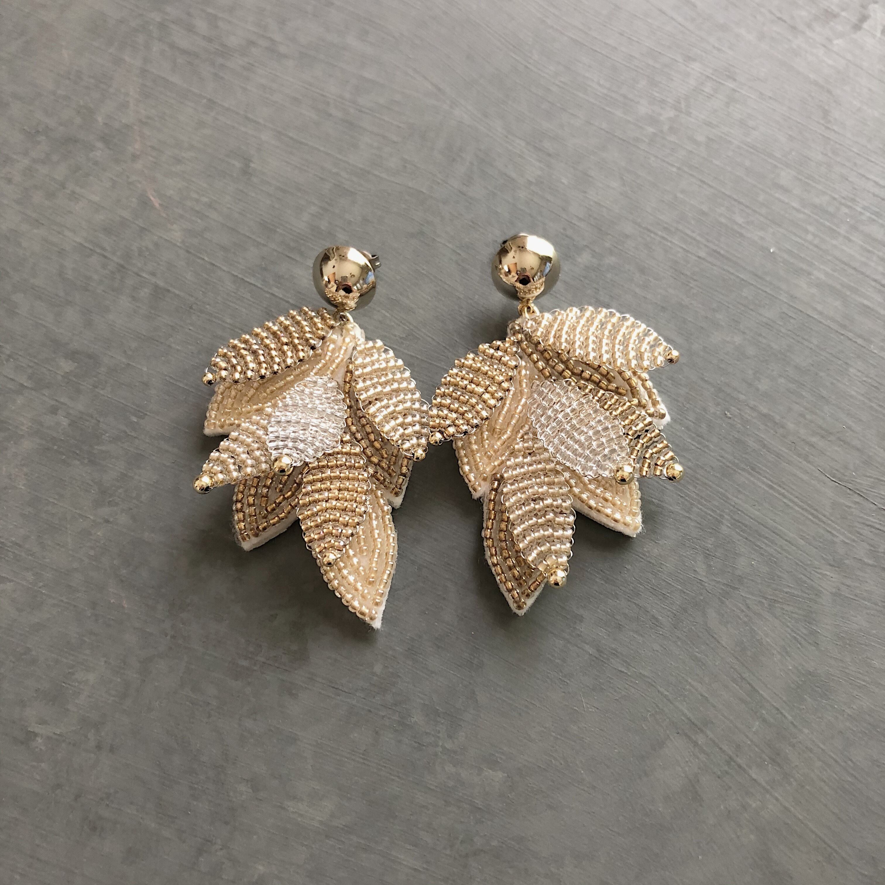 クリアなベージュとアンティークゴールド系のビーズにゴールドの金具がとてもインパクトのあるアイテム。