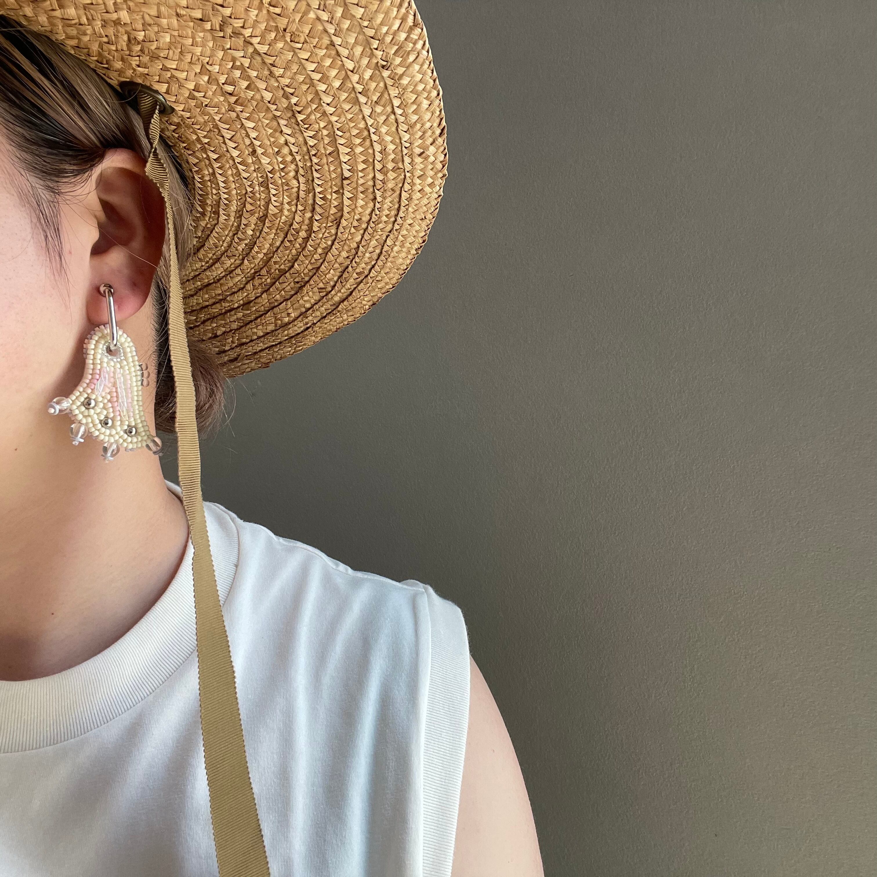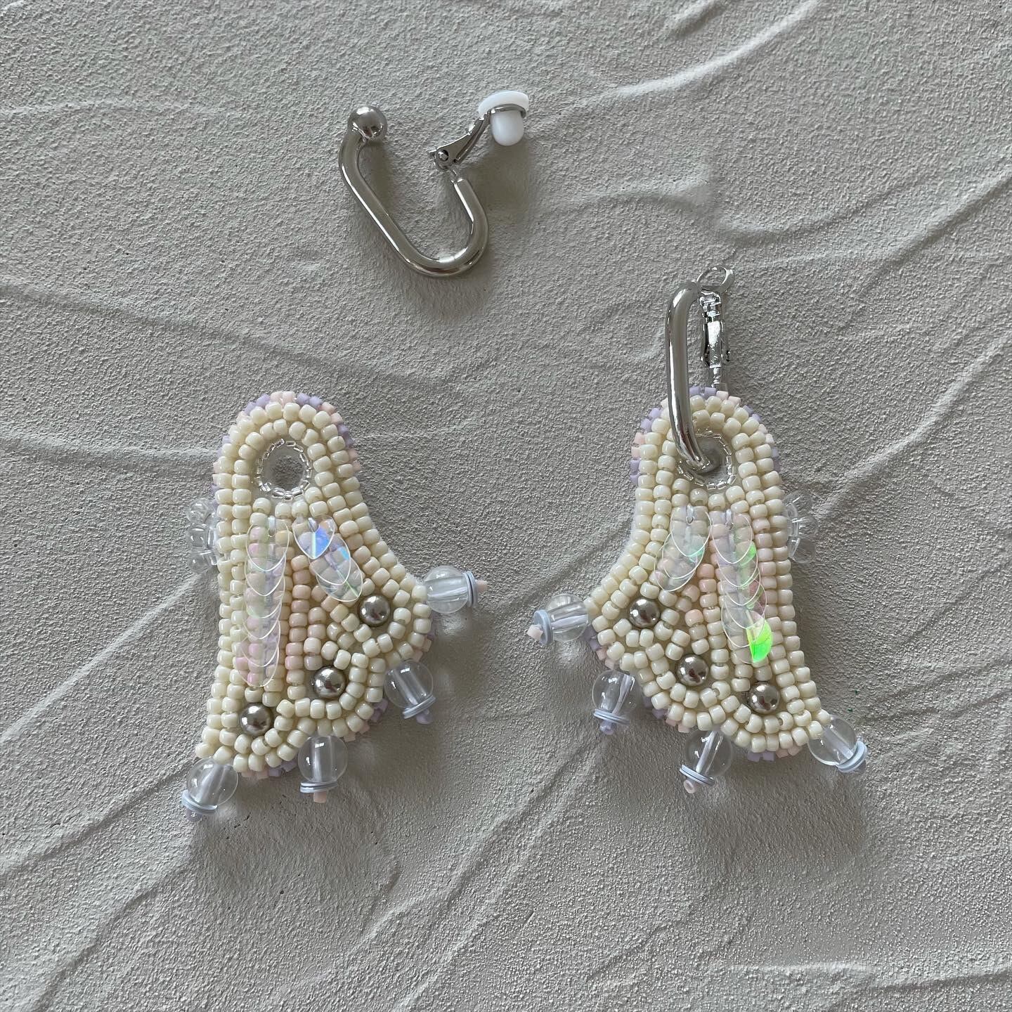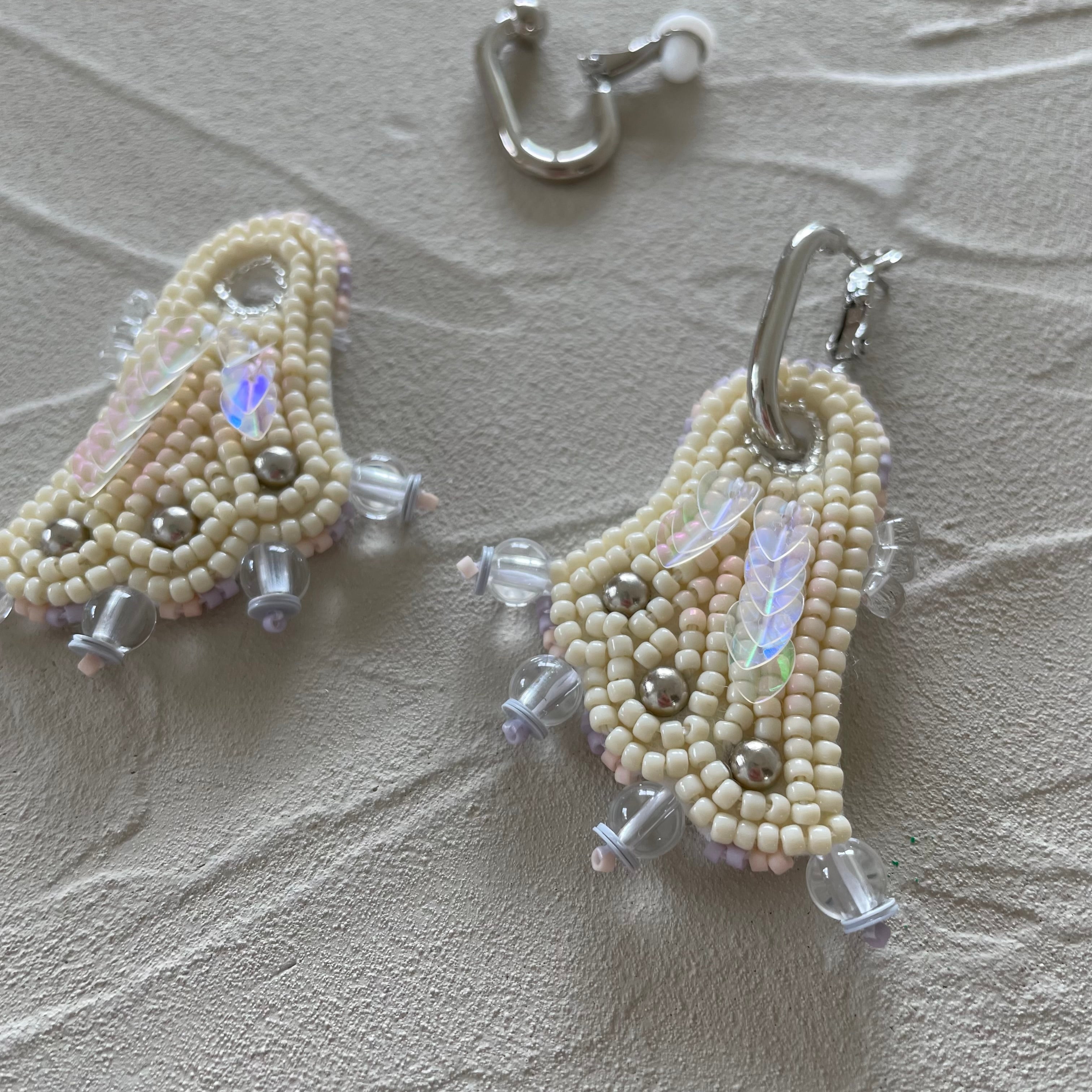オフホワイトベースのビーズやオーロラのスパンコールにペールピンクとラベンダーカラーのデリカビーズを使用。