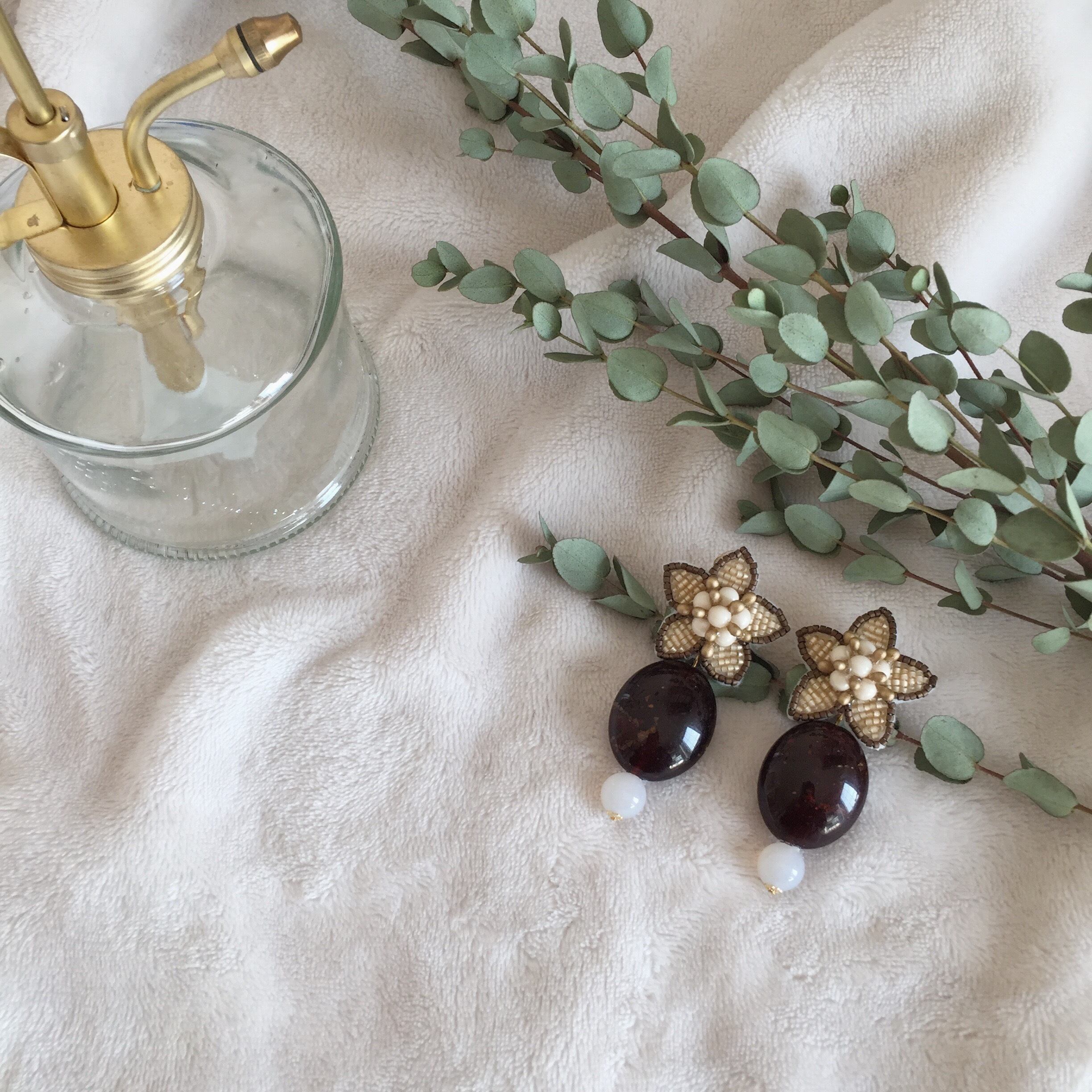 ビーズ刺繍されたお花モチーフに大きいアクリルビーズ、天然石がポイントのアクセサリーです。
