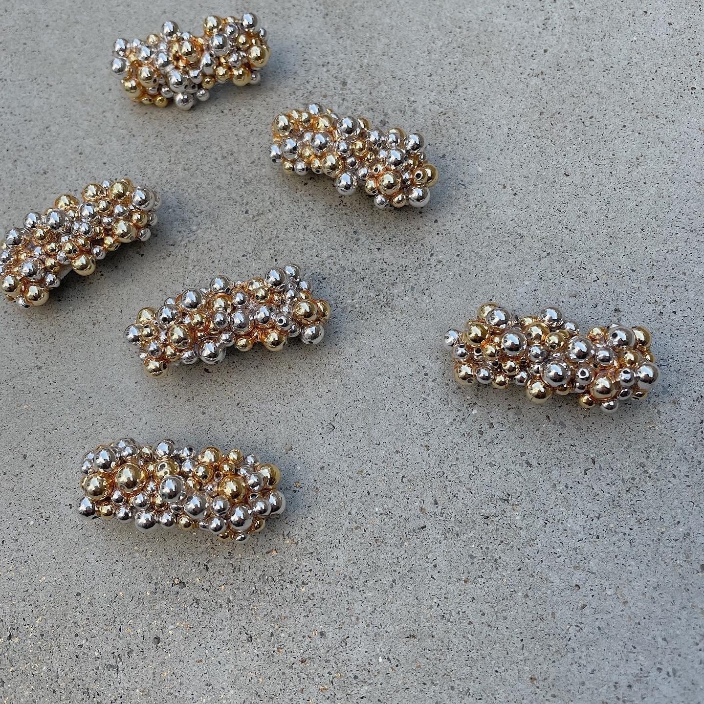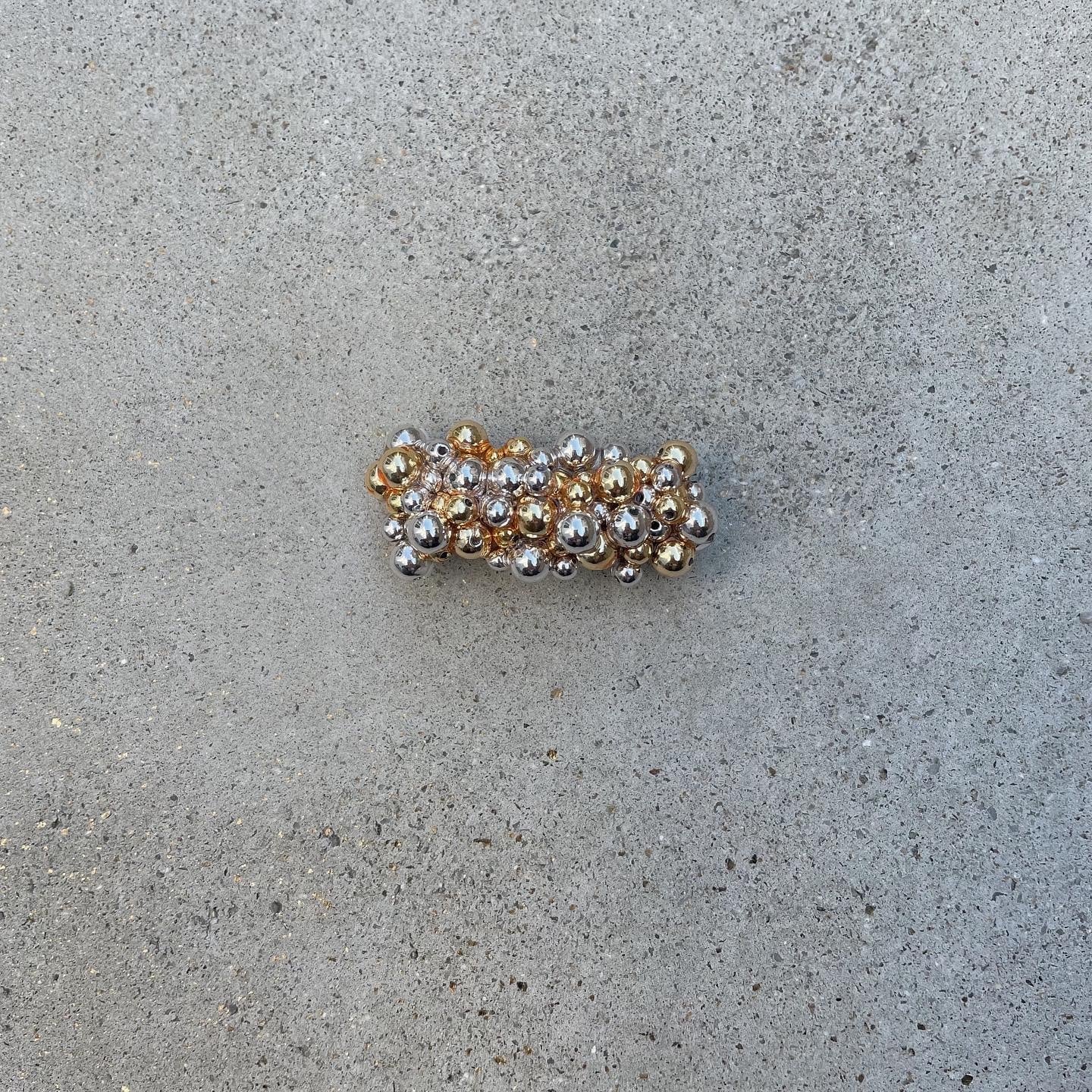 シルバーとゴールドの大小のパールビーズを編んだヘアアクセサリーです。