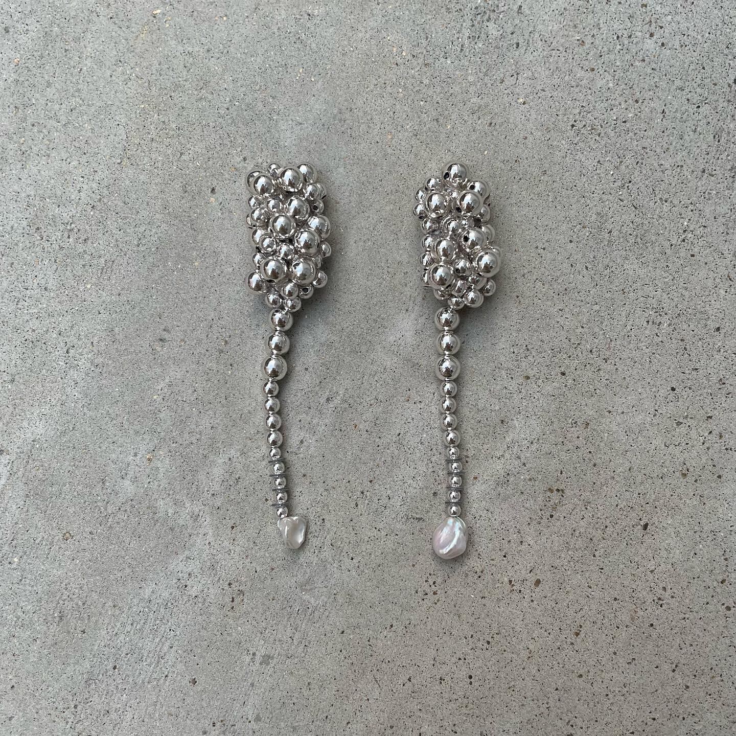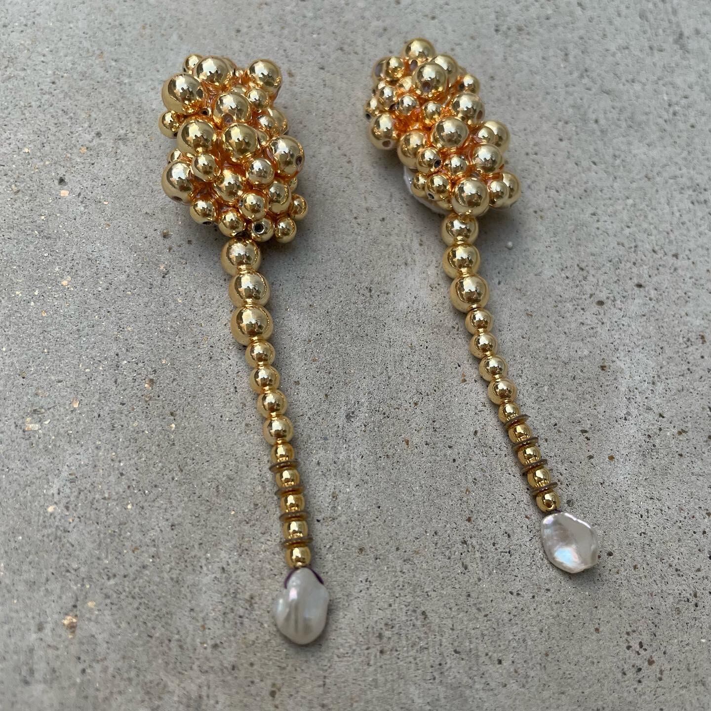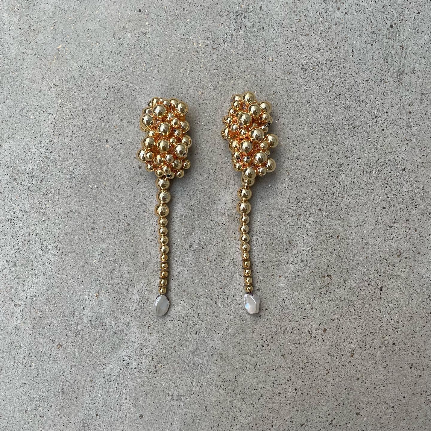 シルバーとゴールドの大小のメタリックパールを使用した耳飾り。