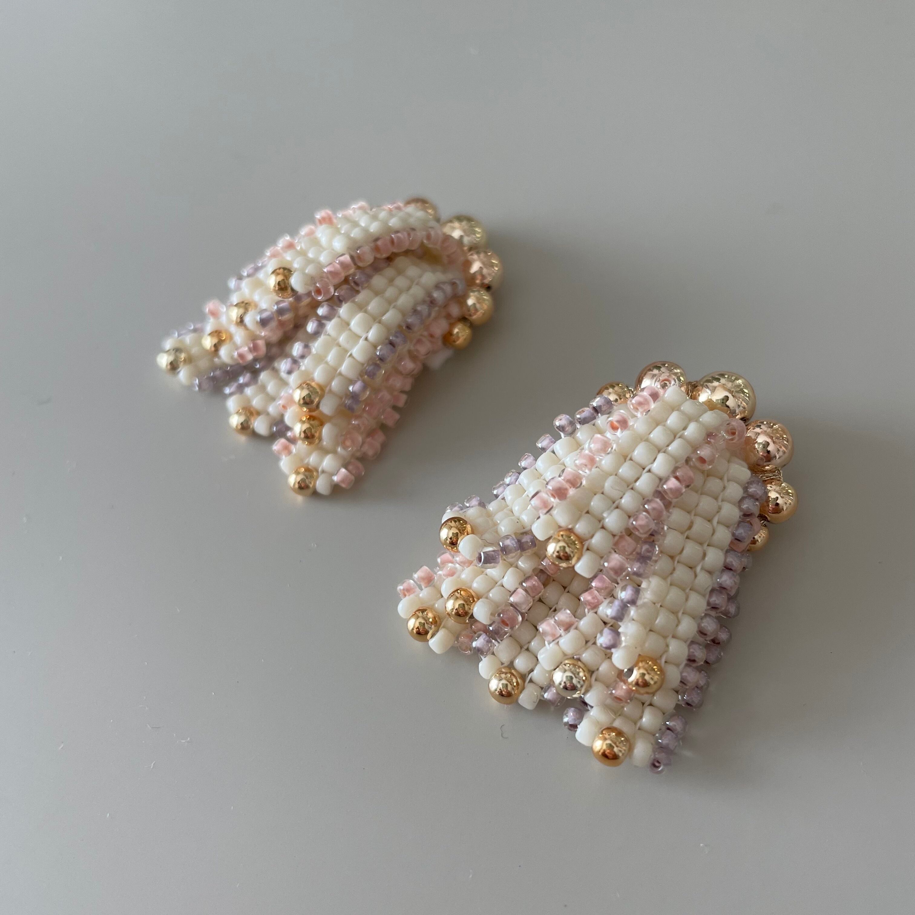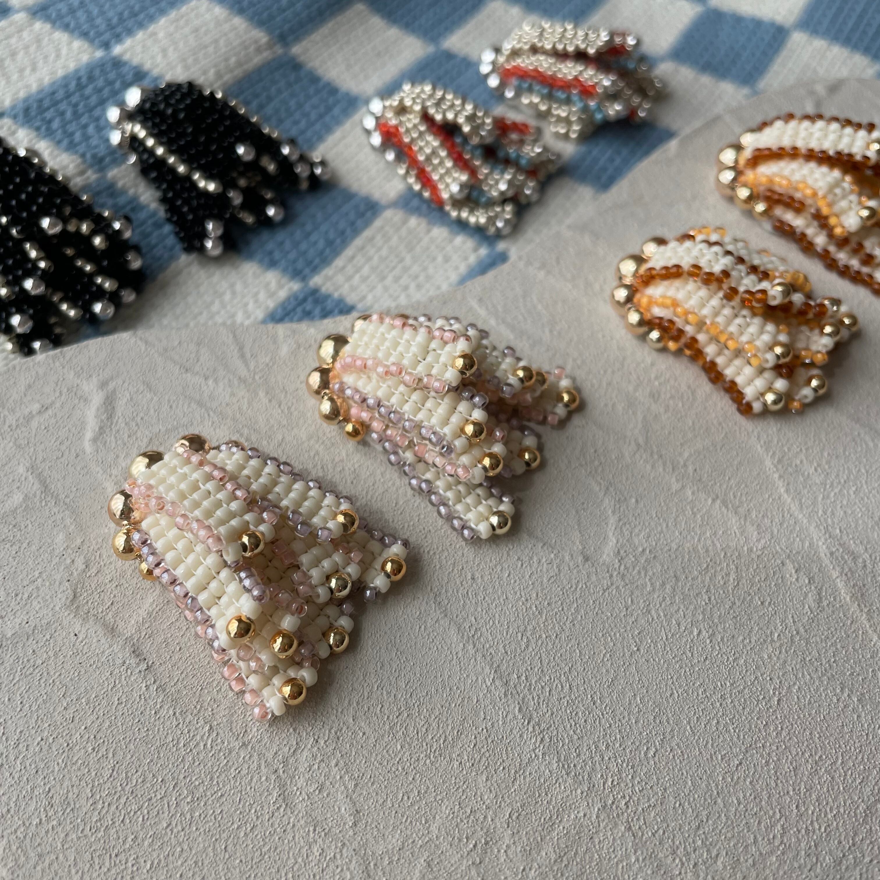 ビーズステッチでパーツを一から編んで、一つ一つを重ねた、リボンを束ねたようなアイテム。
