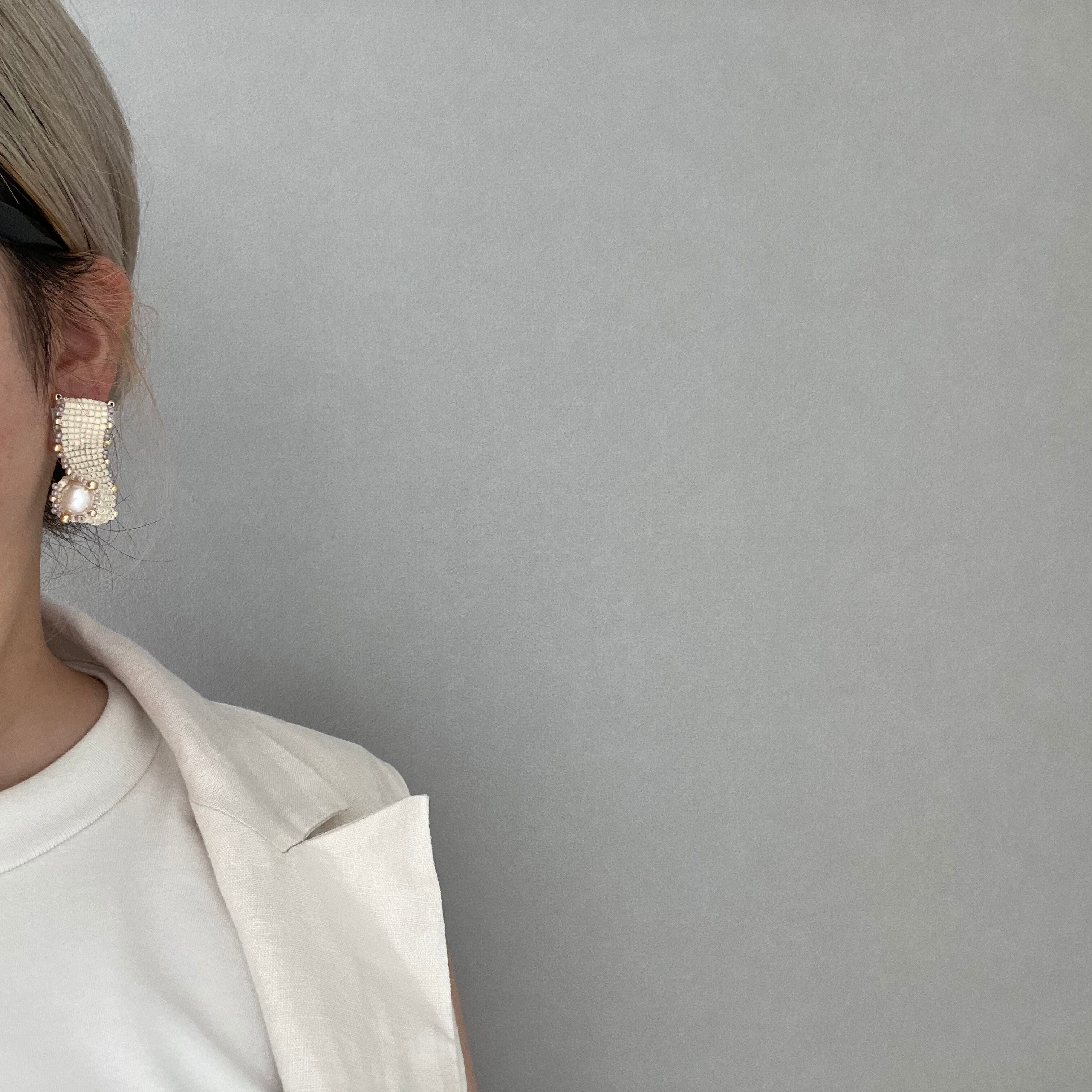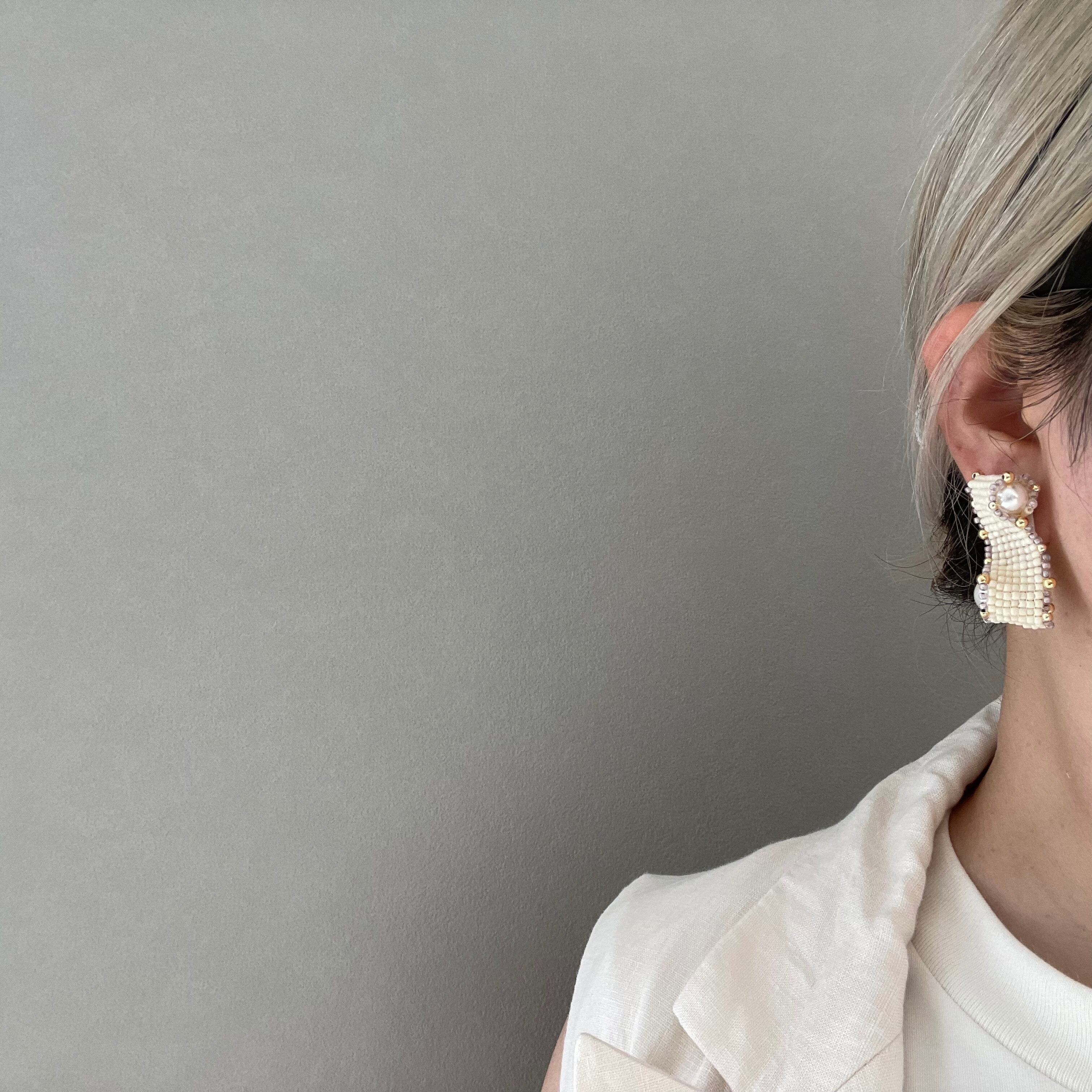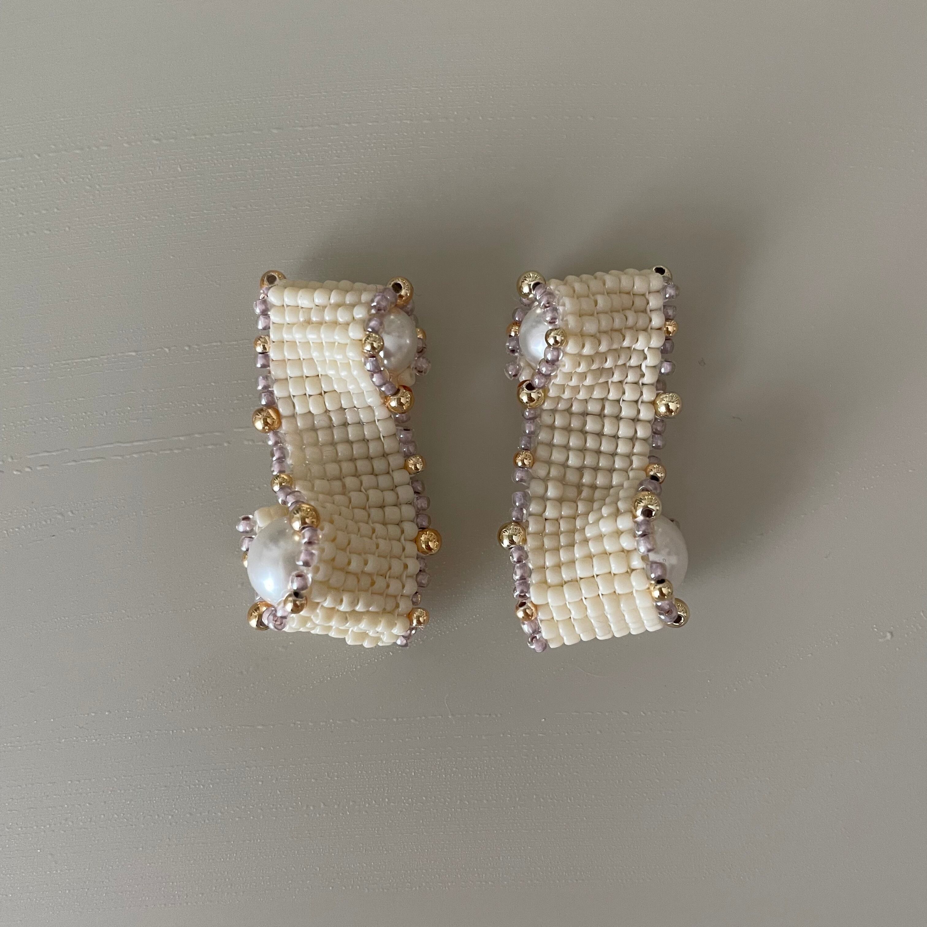 ビーズステッチで編んだ帯を、立体的なウェーブ状にして大きさの異なるパールを巻き込みました。
