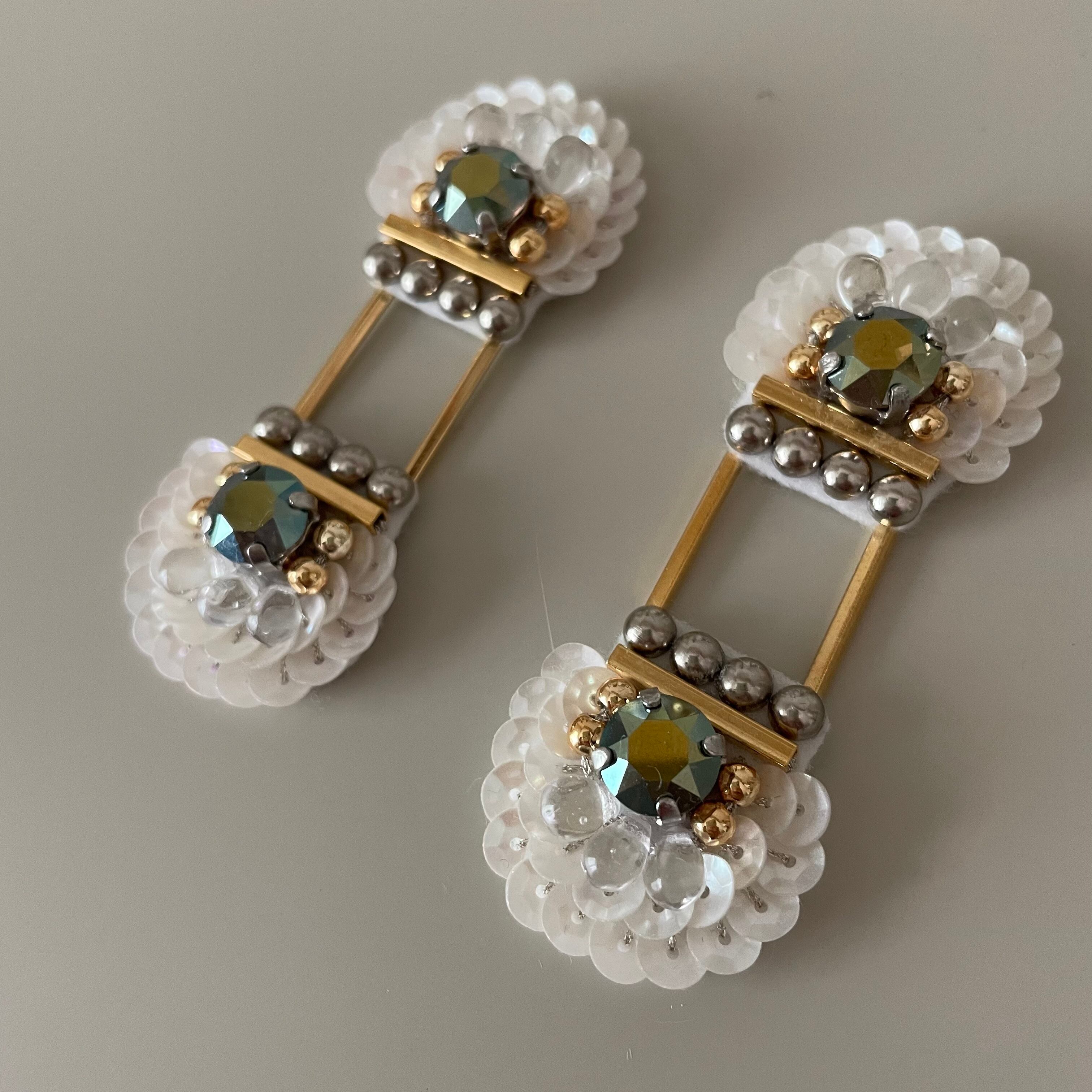 フランスのスパンコールと、角度によって光り方が変わるグリーンがかったスワロフスキーが目を引く耳飾り。