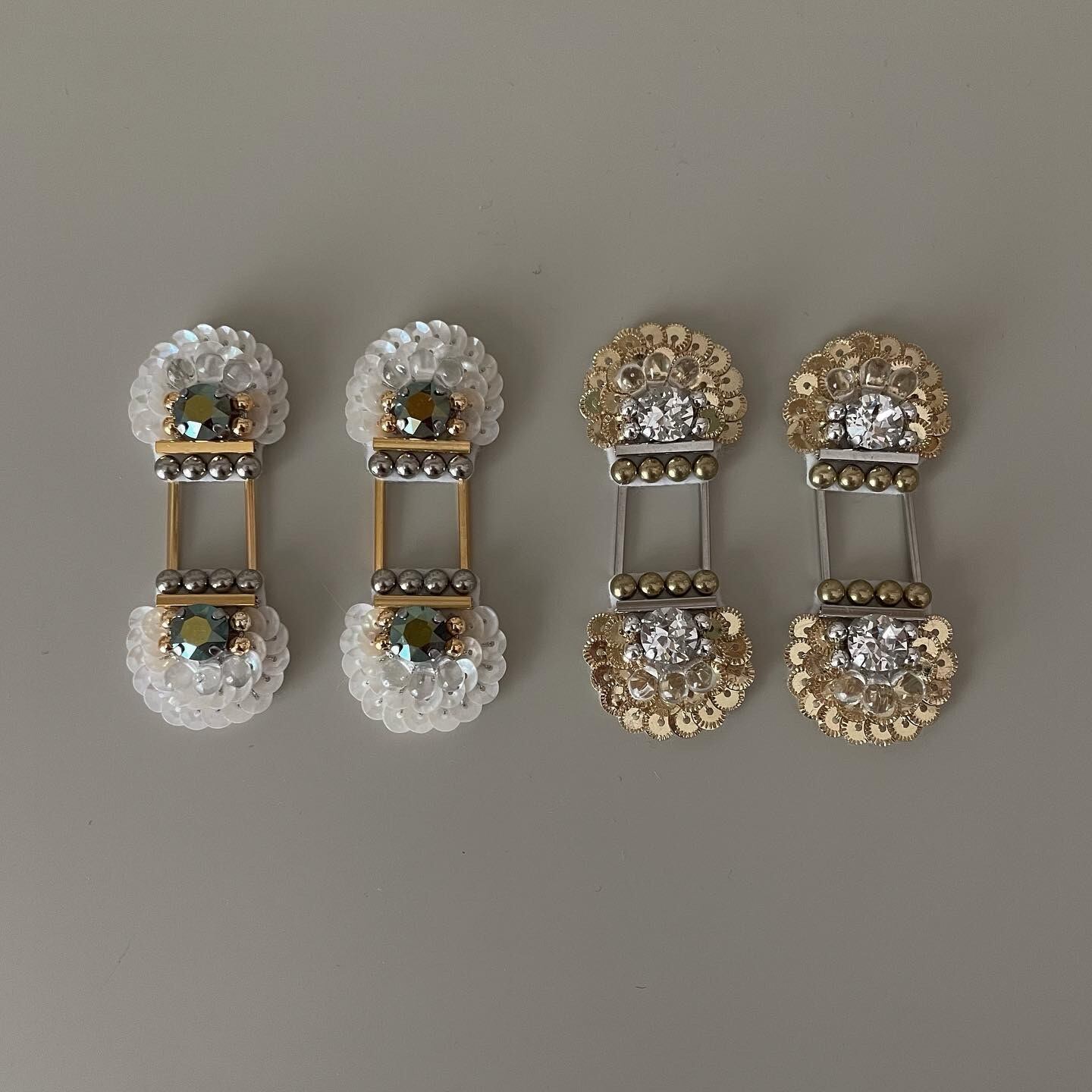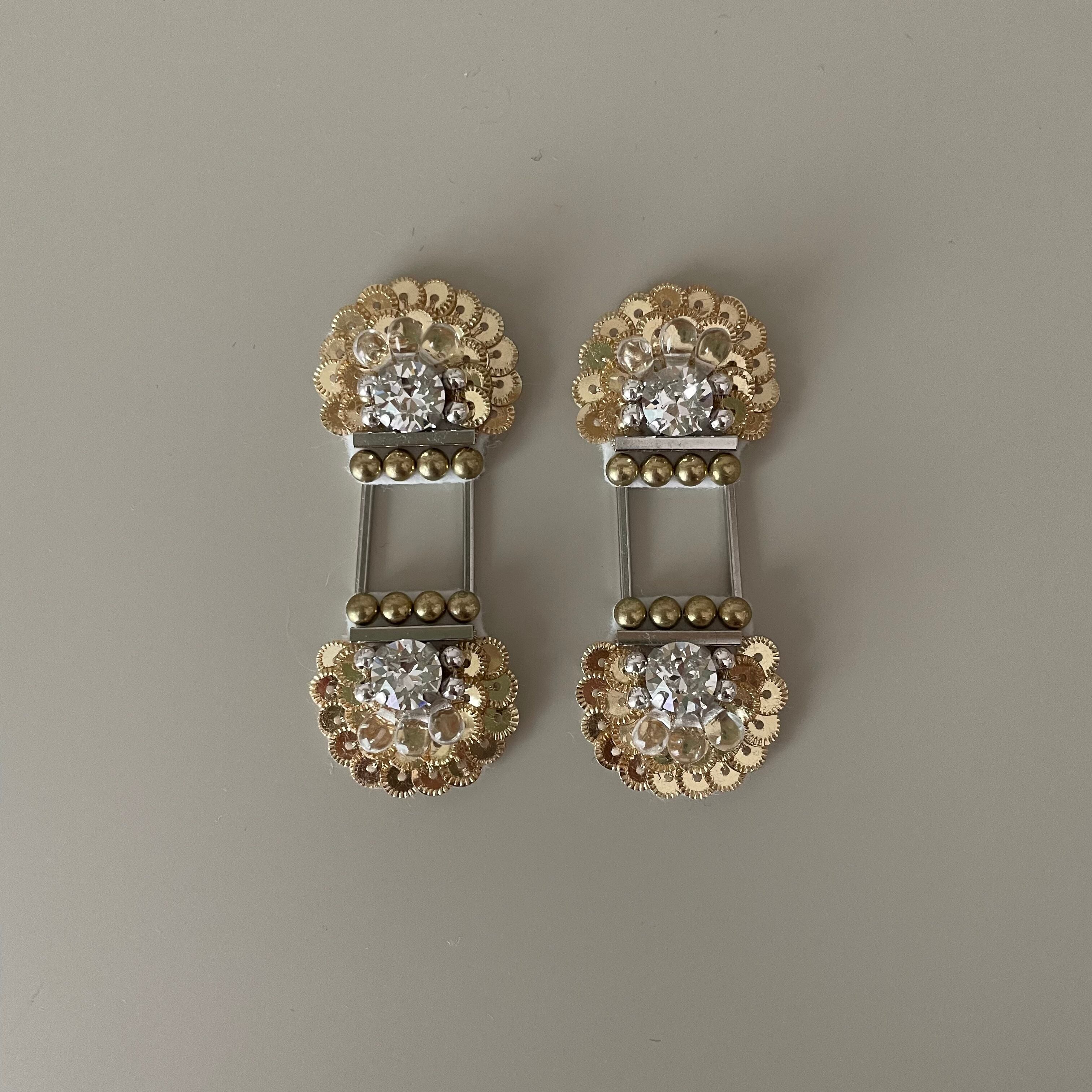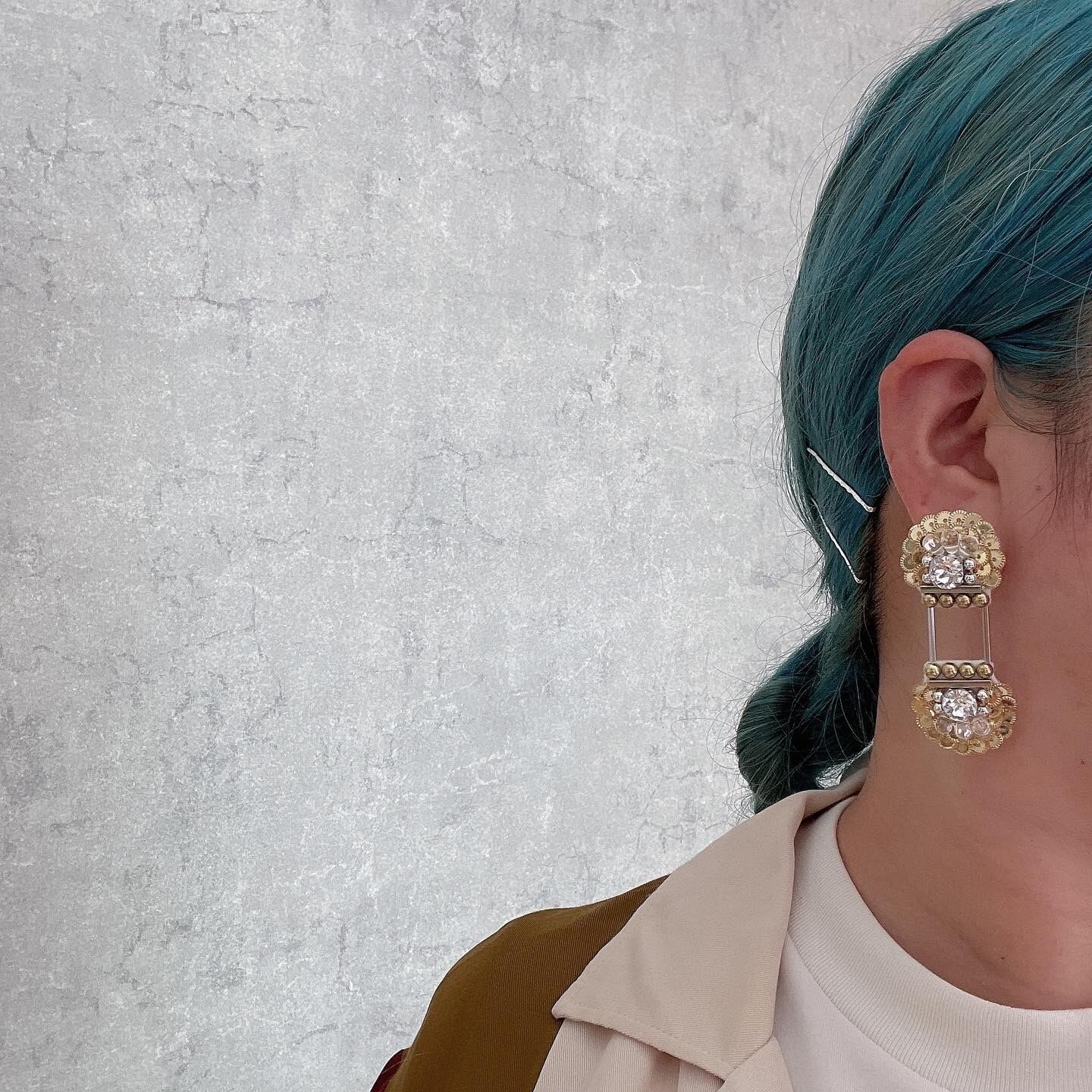 フランスのゴールドのスパンコールに、角度によって光り方が変わるクリスタルのスワロフスキーが目を引く耳飾り。