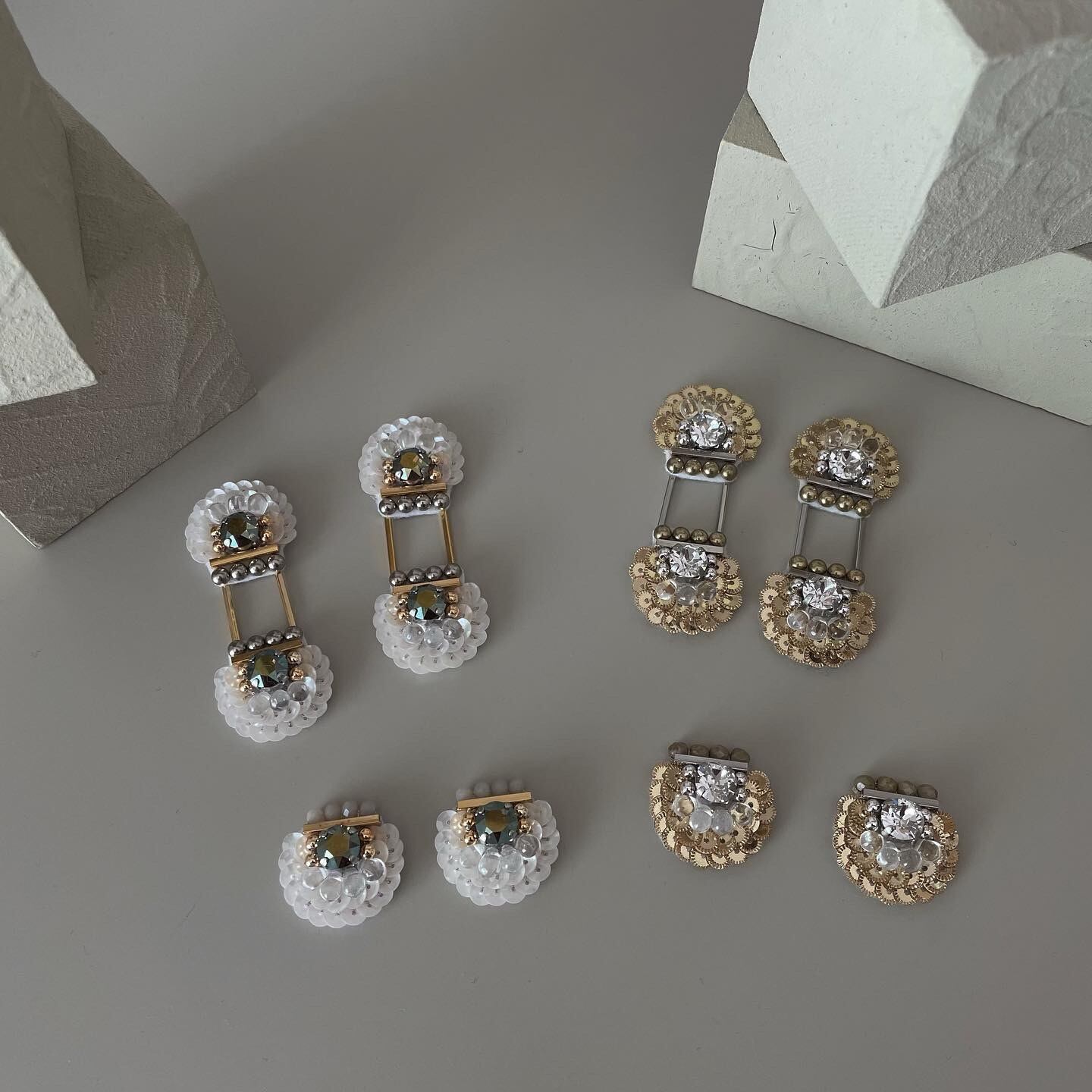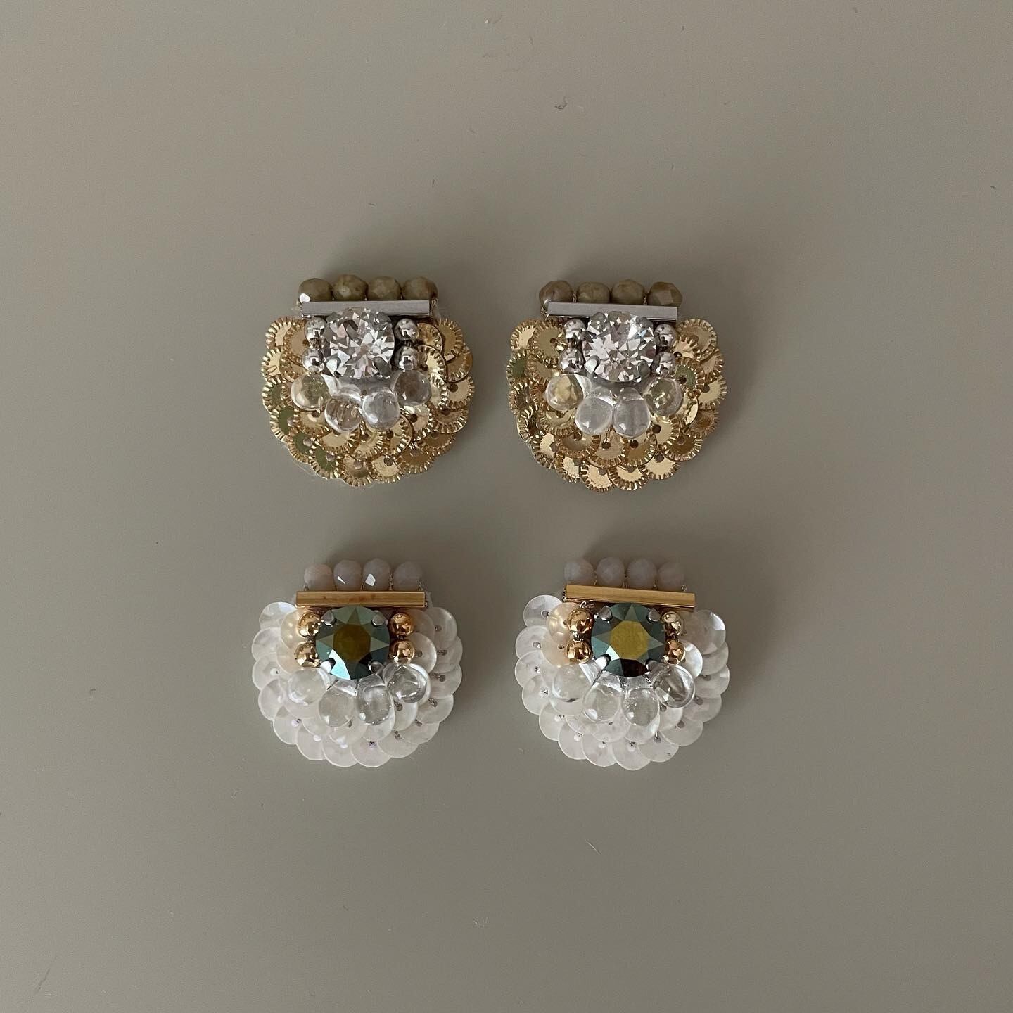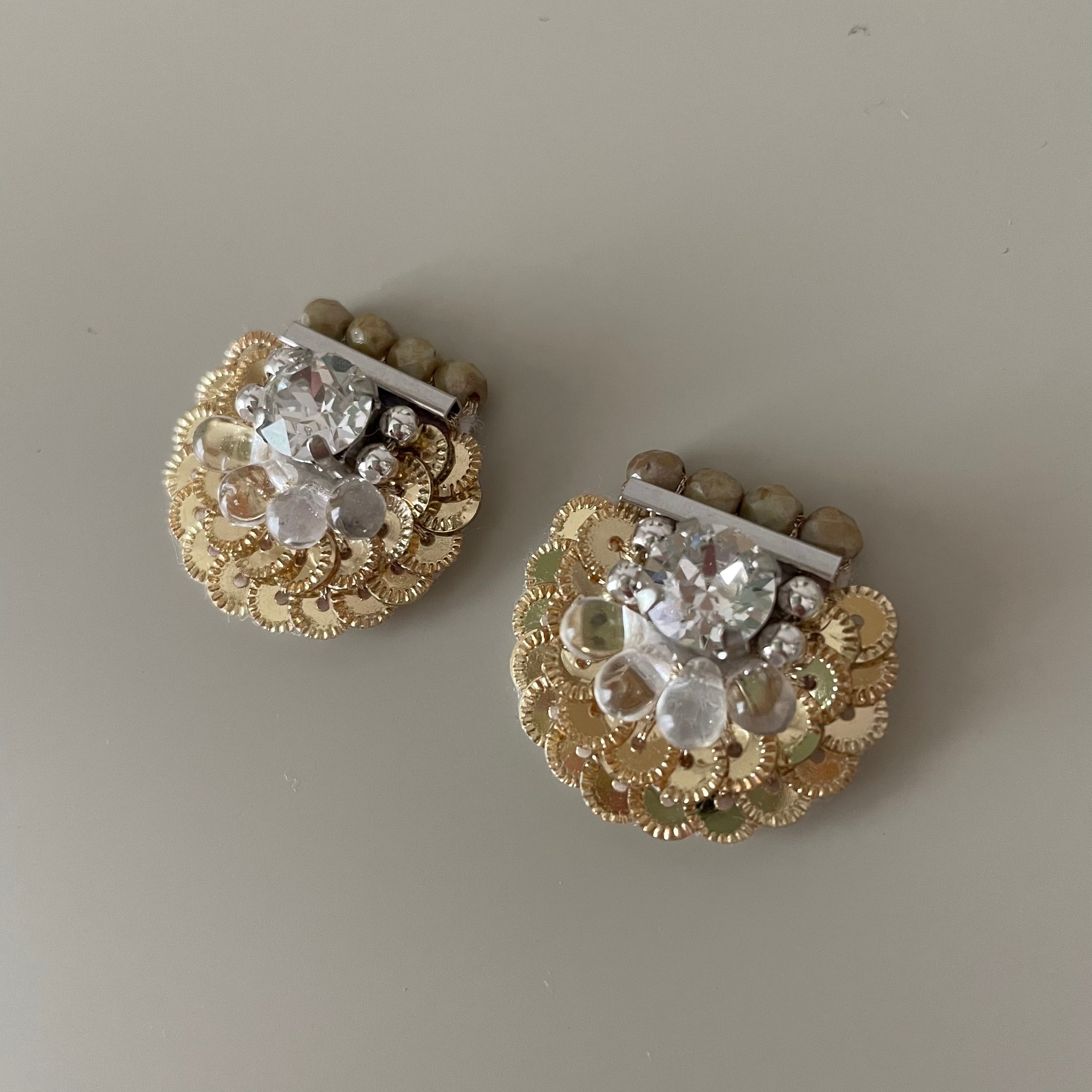 フランスのスパンコールと、角度によって光り方が変わるクリスタルなスワロフスキーを使用した、使いやすい小ぶりの耳飾りです。