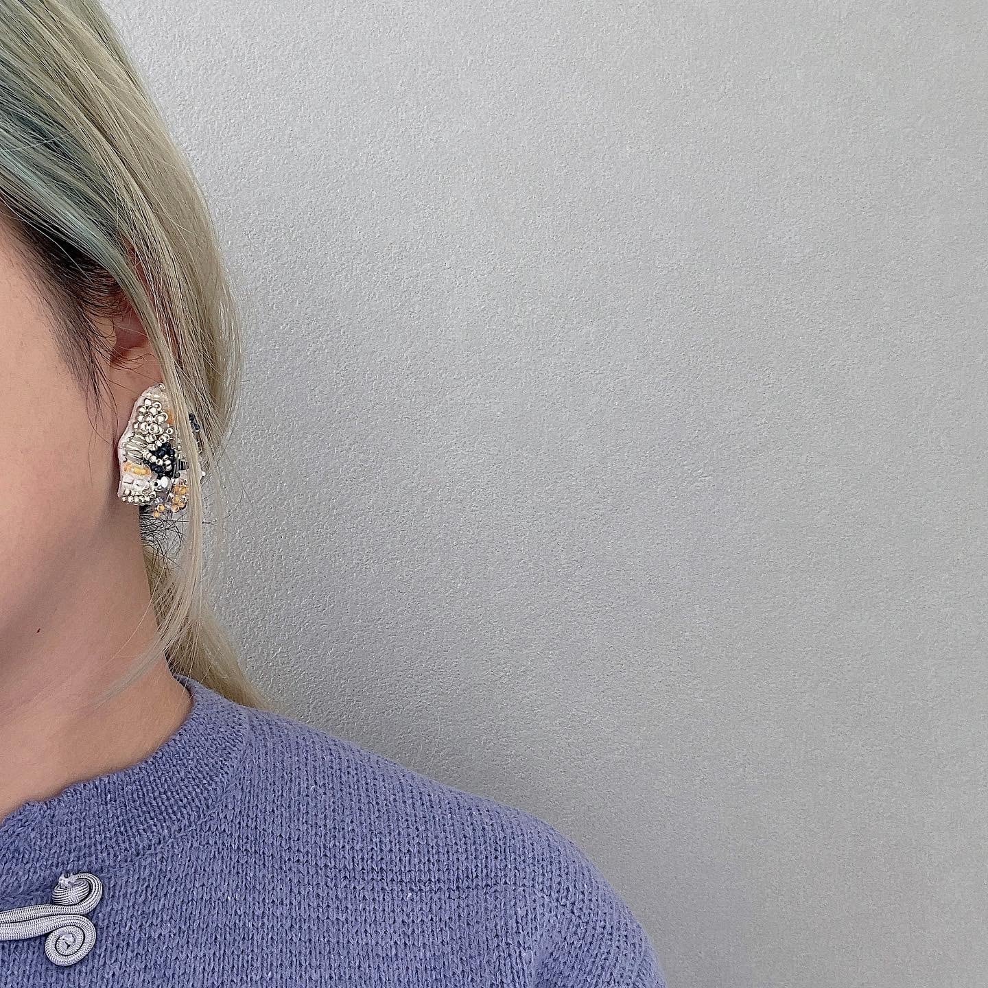 いろんな種類のビーズがランダムに刺繍された耳飾り。