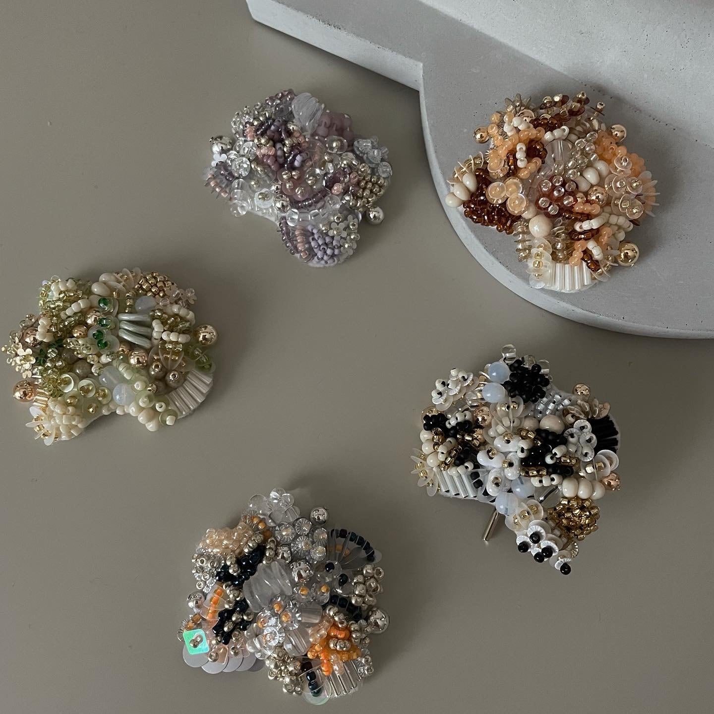 刺繍はランダムにされているので、同じカラーでも色の配分やビーズの配置が異なります。