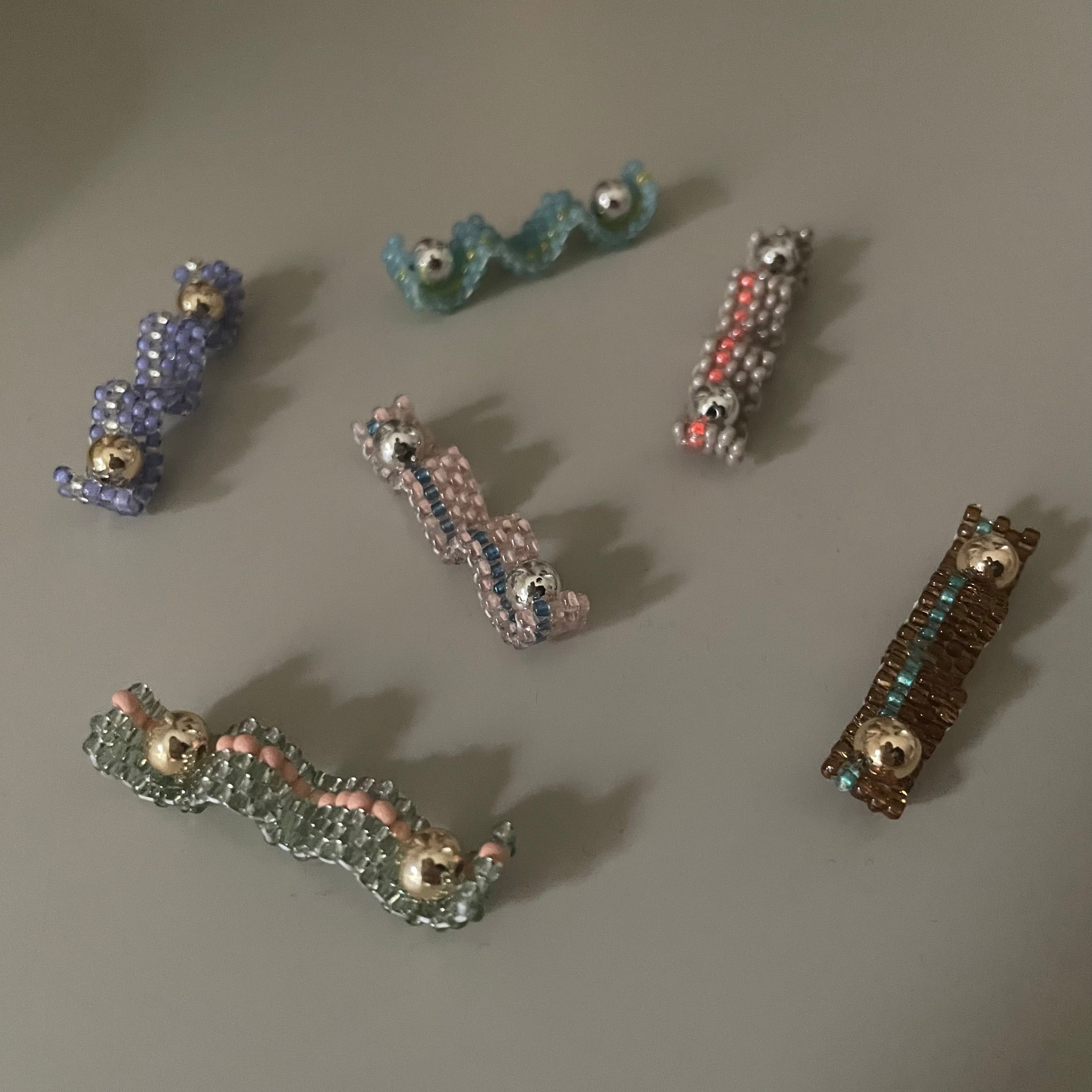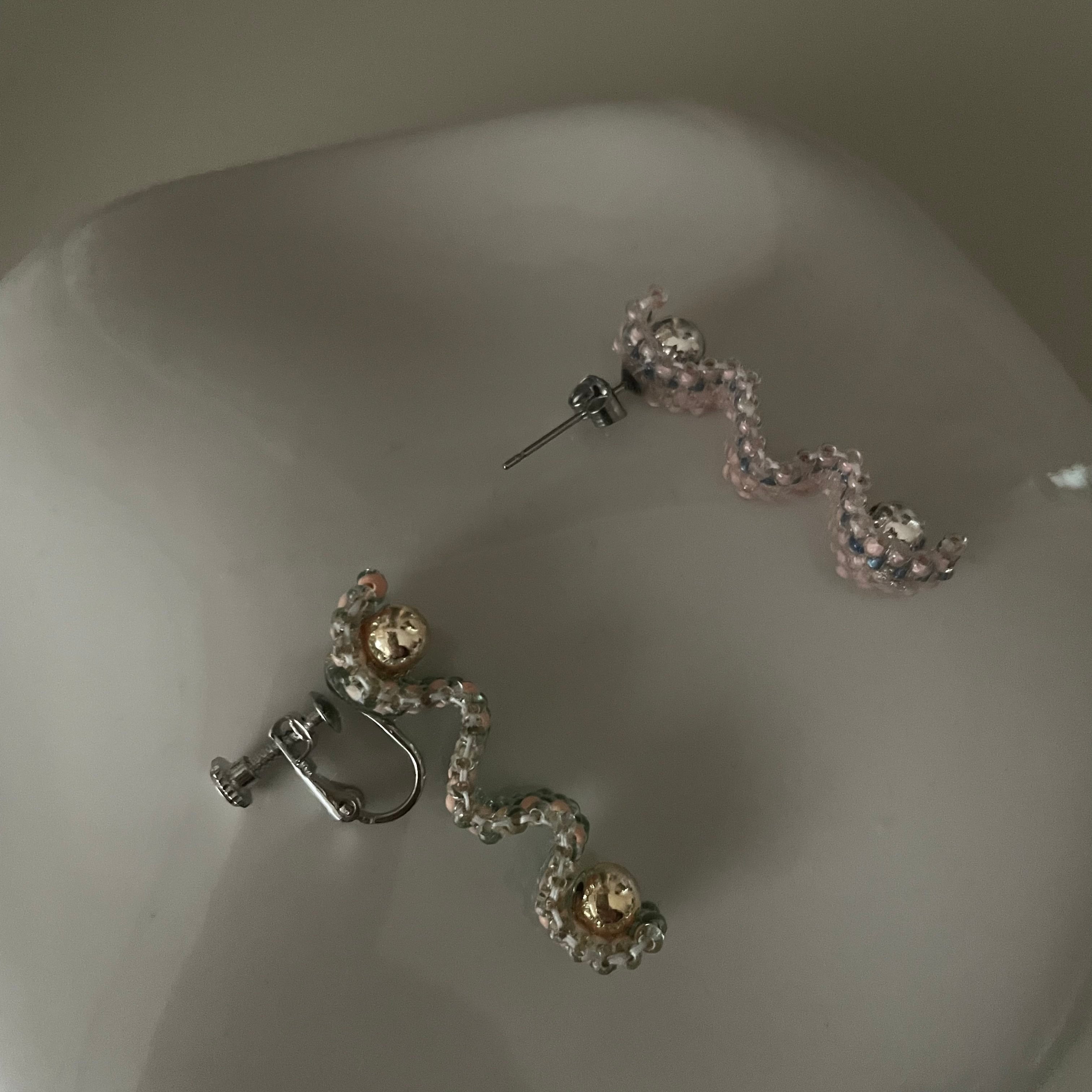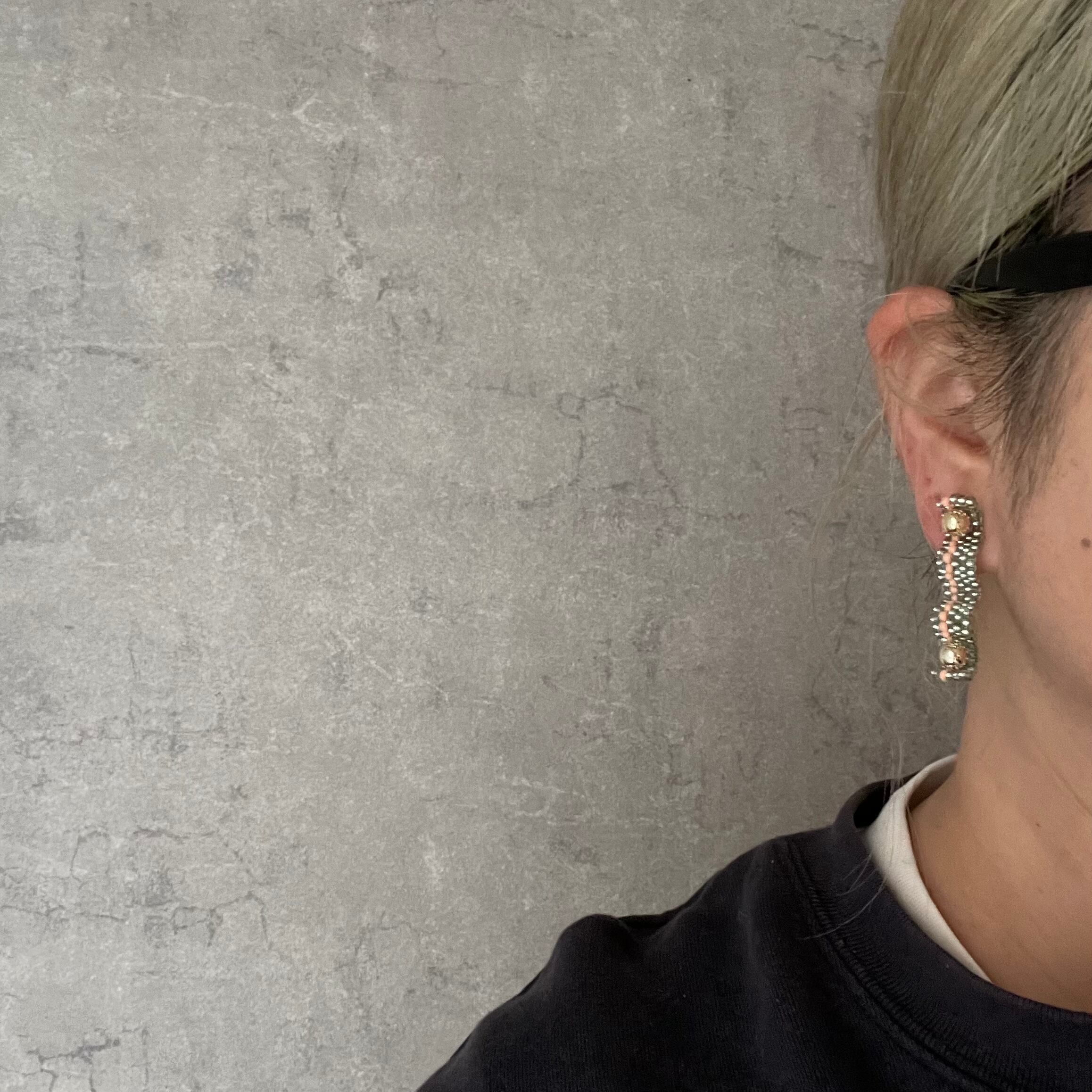 ビーズステッチでスティックに編み、ウェーブ状にして樹脂で固めた小ぶりの立体感ある耳飾りです。