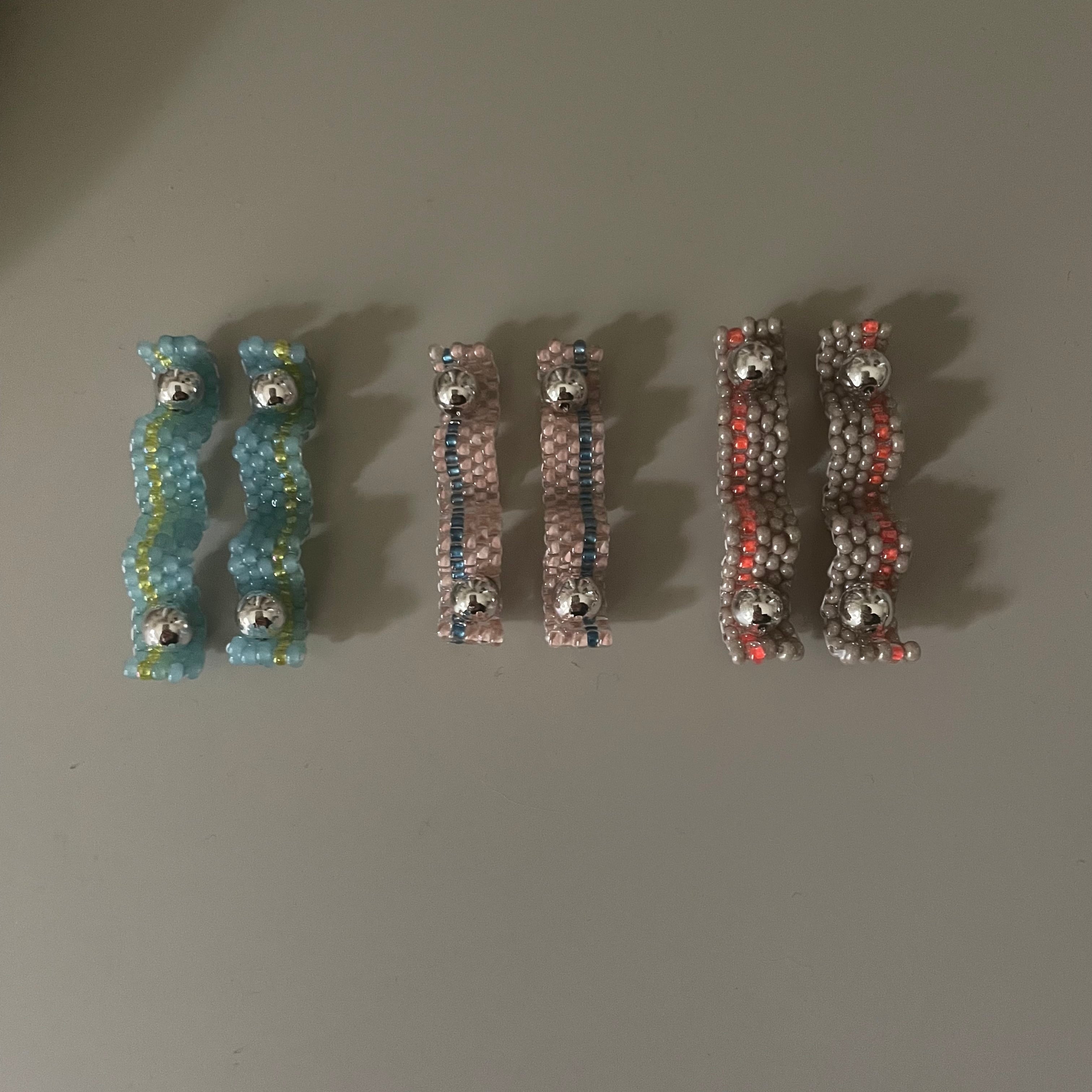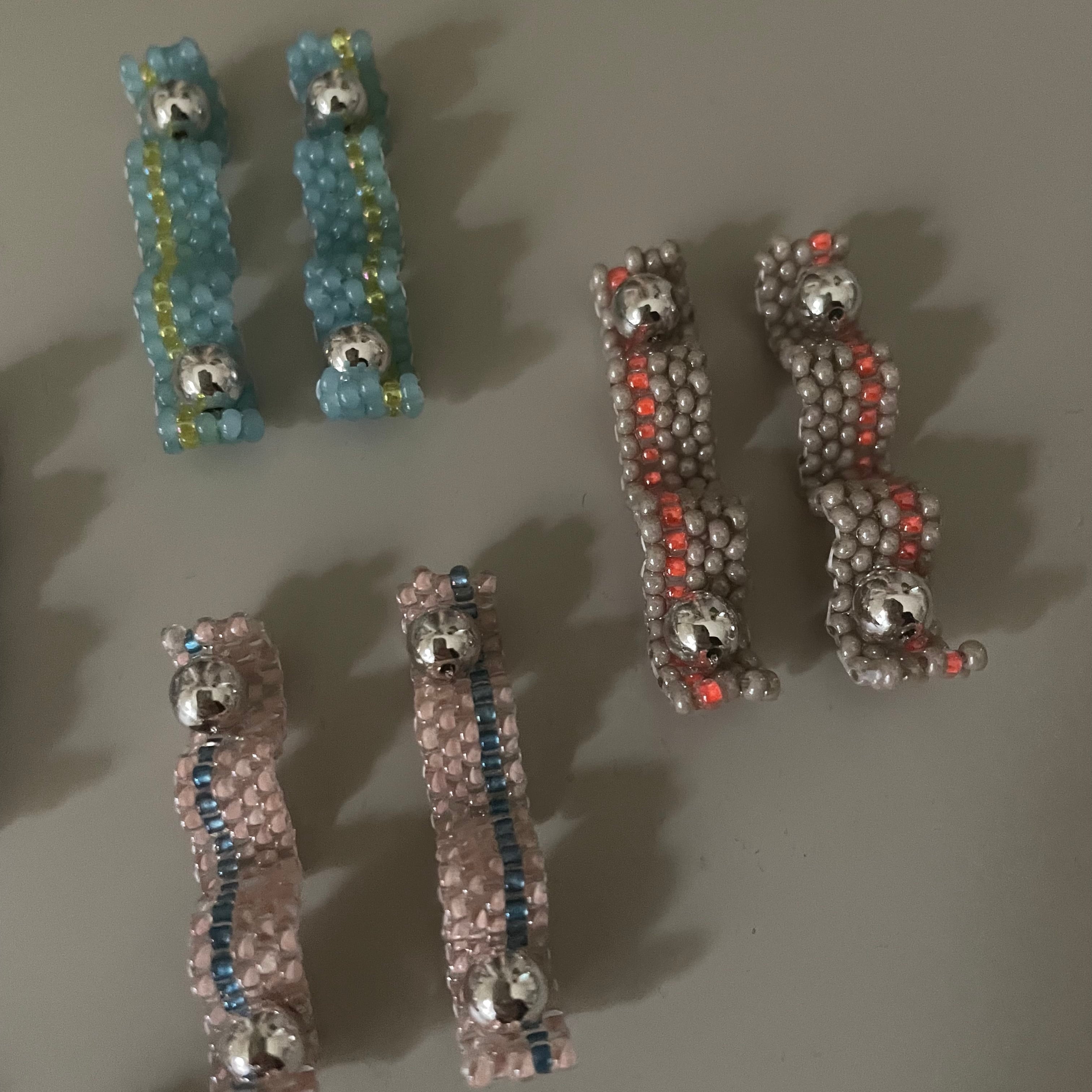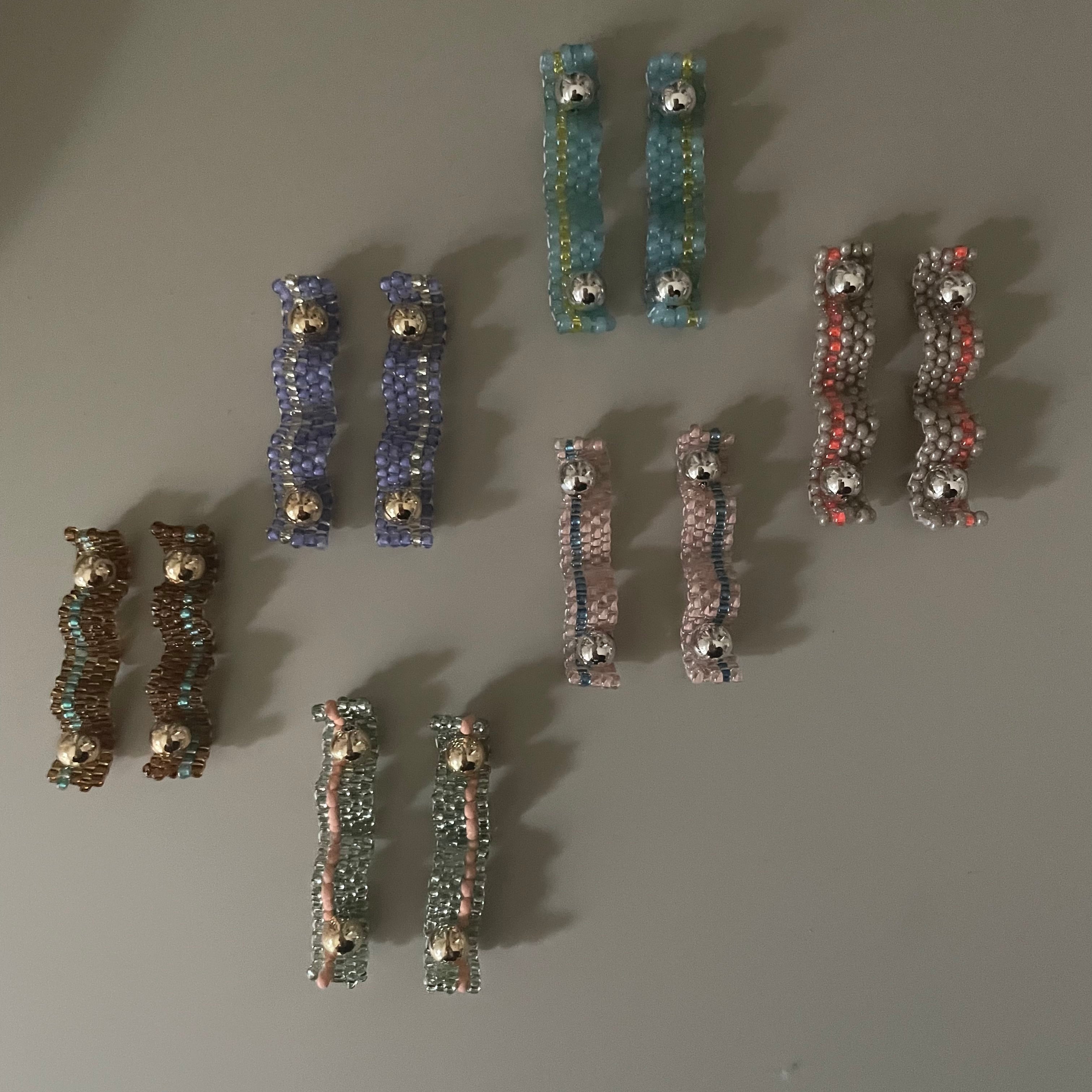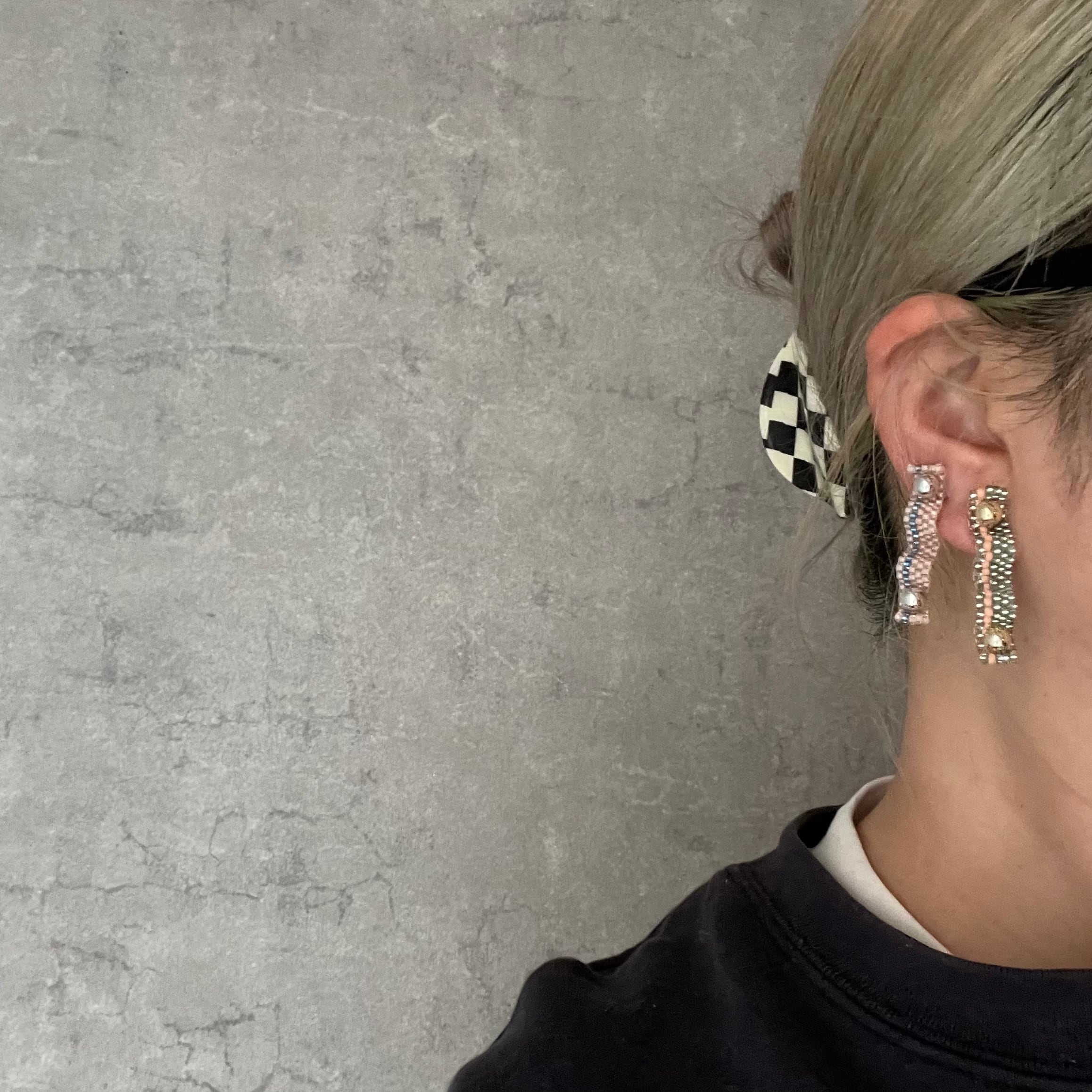 ビーズステッチでスティックに編み、ウェーブ状にして樹脂で固めた小ぶりの立体感ある耳飾りです。