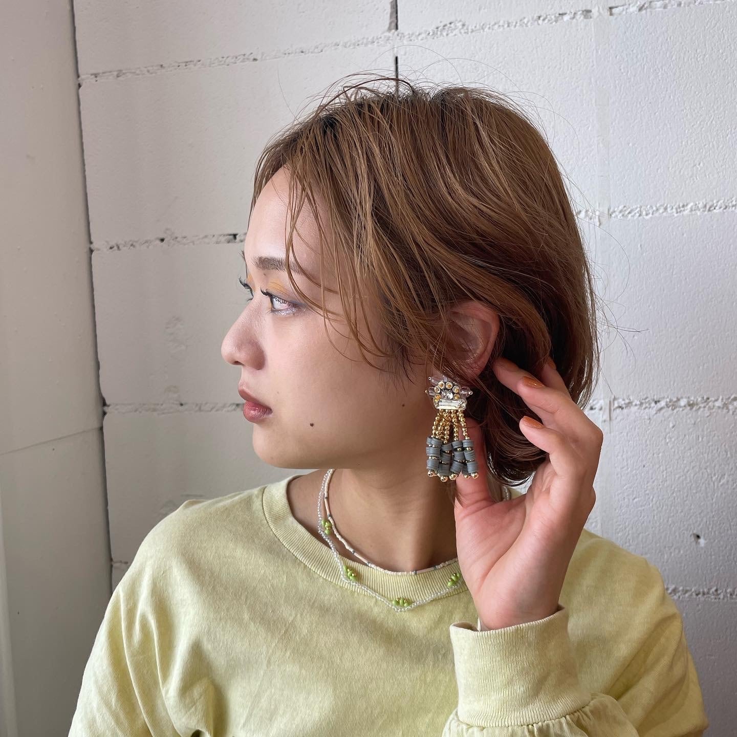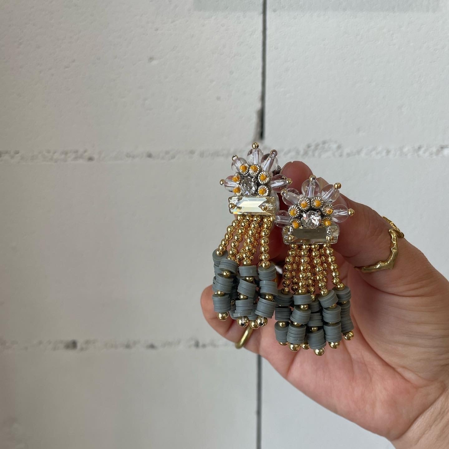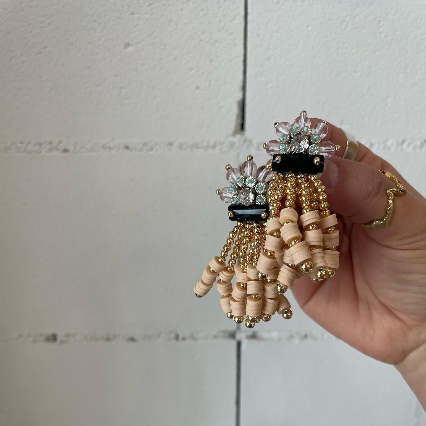 ゴールドがベースになっていますが、フリンジ部分のディスクビーズが柔らかい色合いなので着けてもハードな印象になりません。