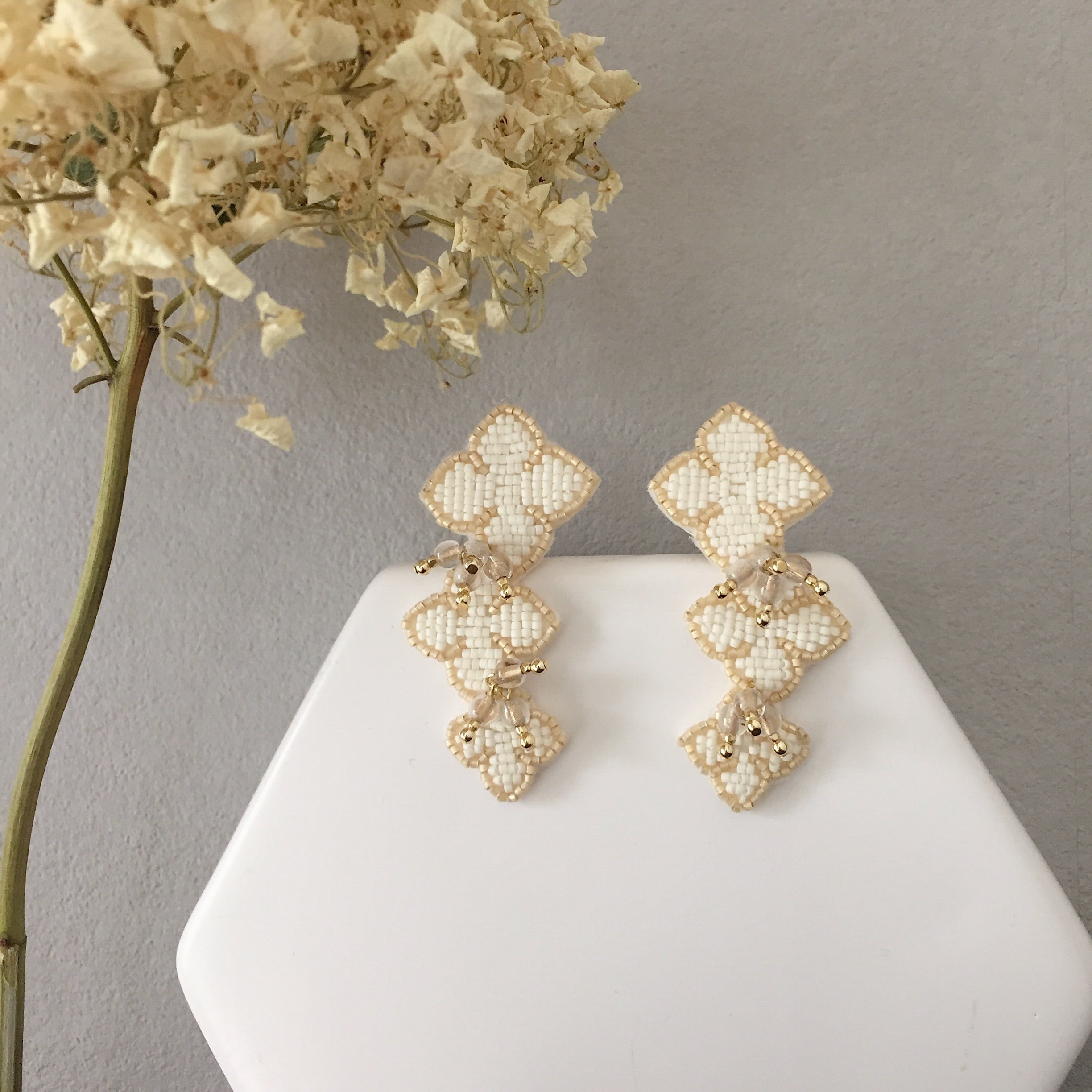 オフホワイトとベージュの柔らかい雰囲気に、チェコビーズがジャラジャラ揺れるデザイン。