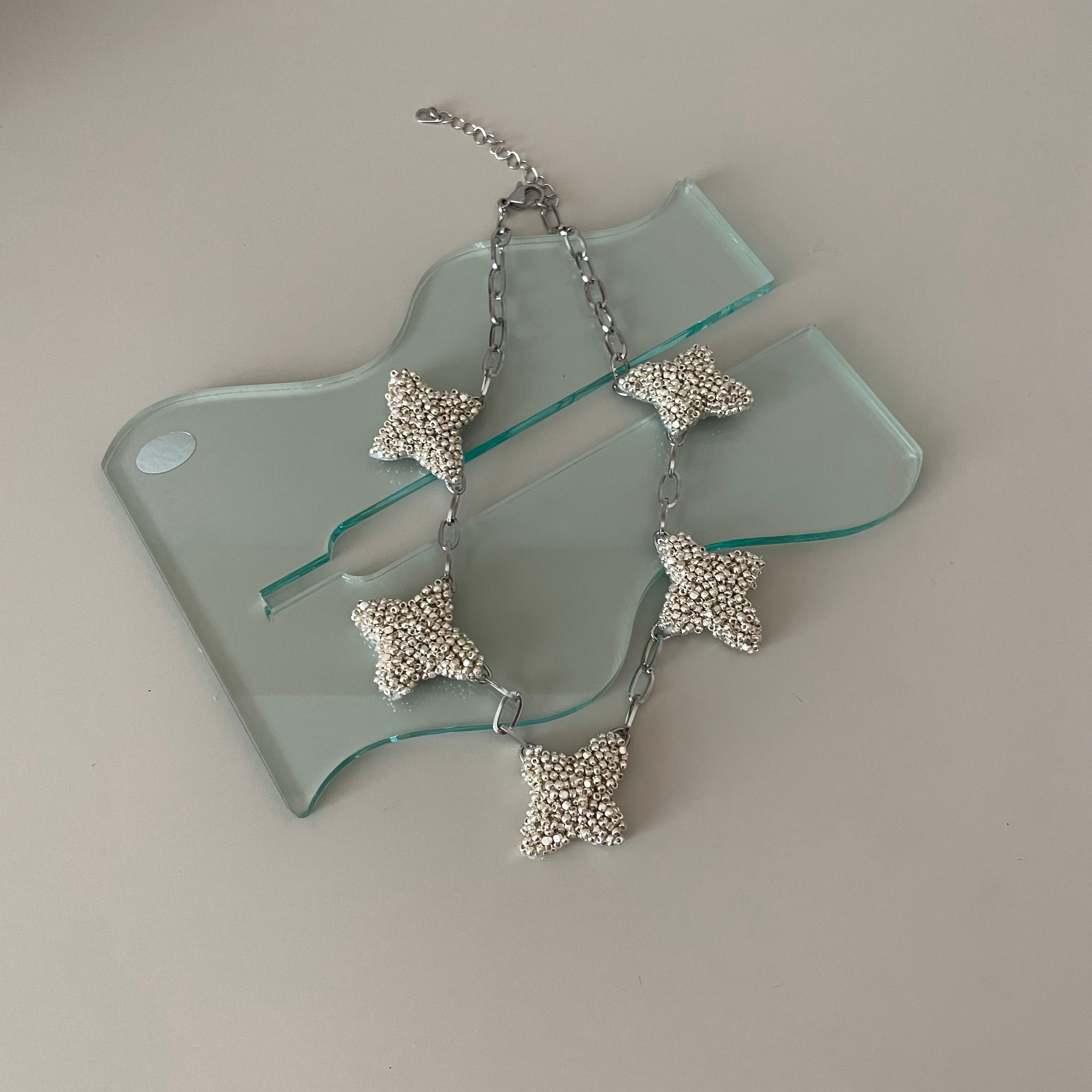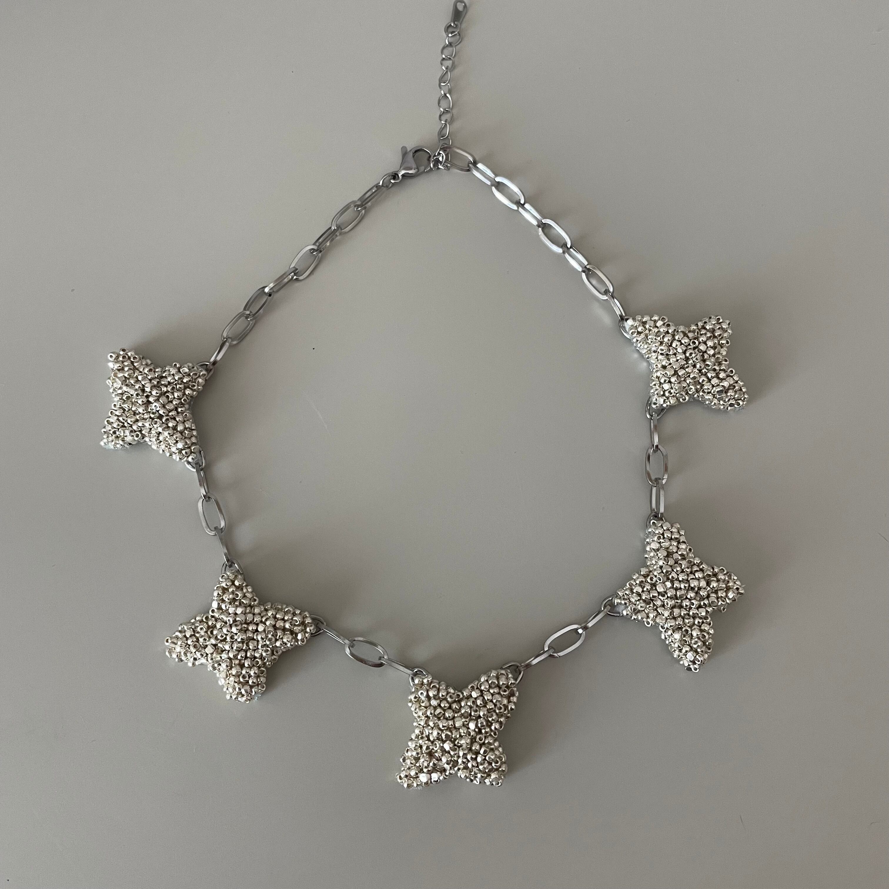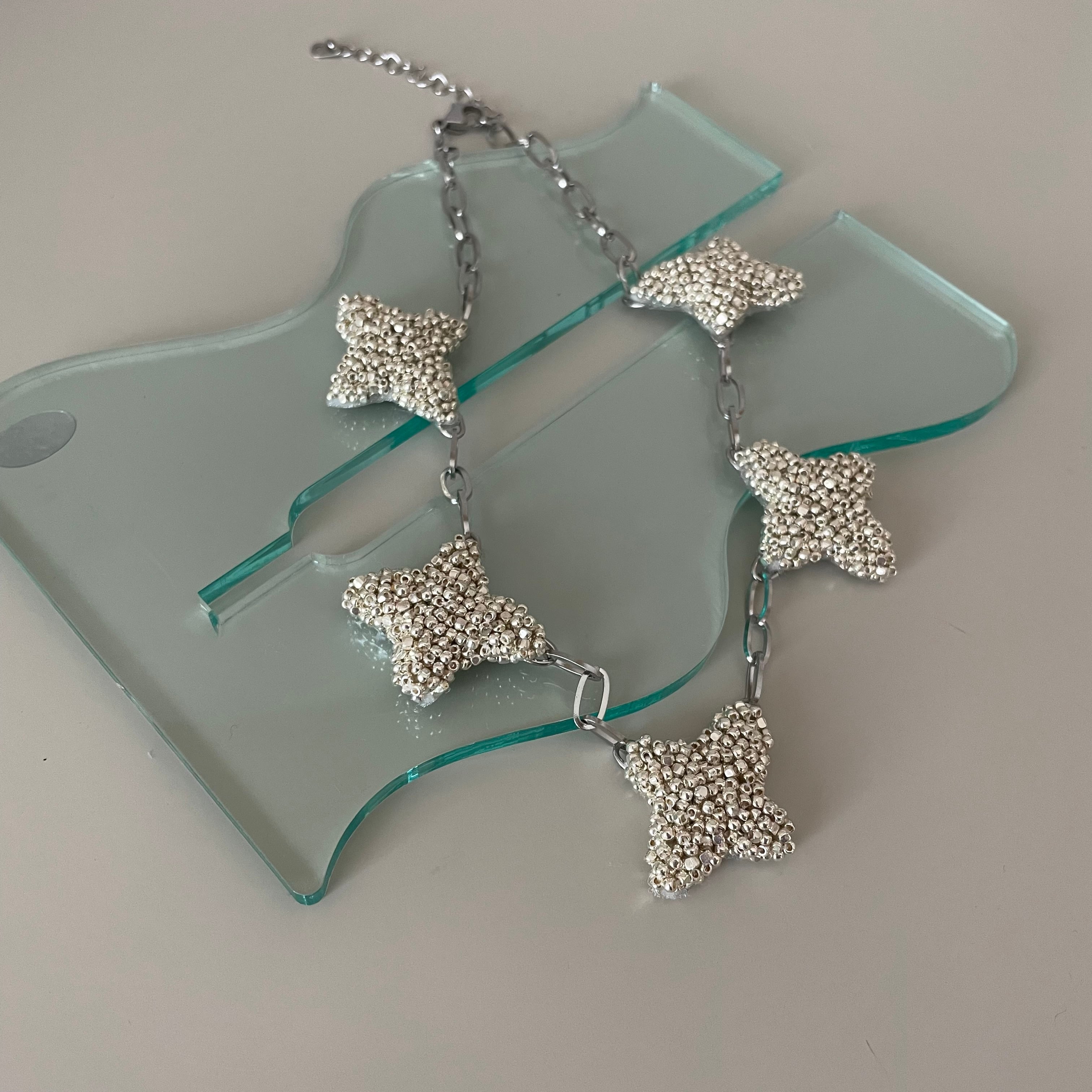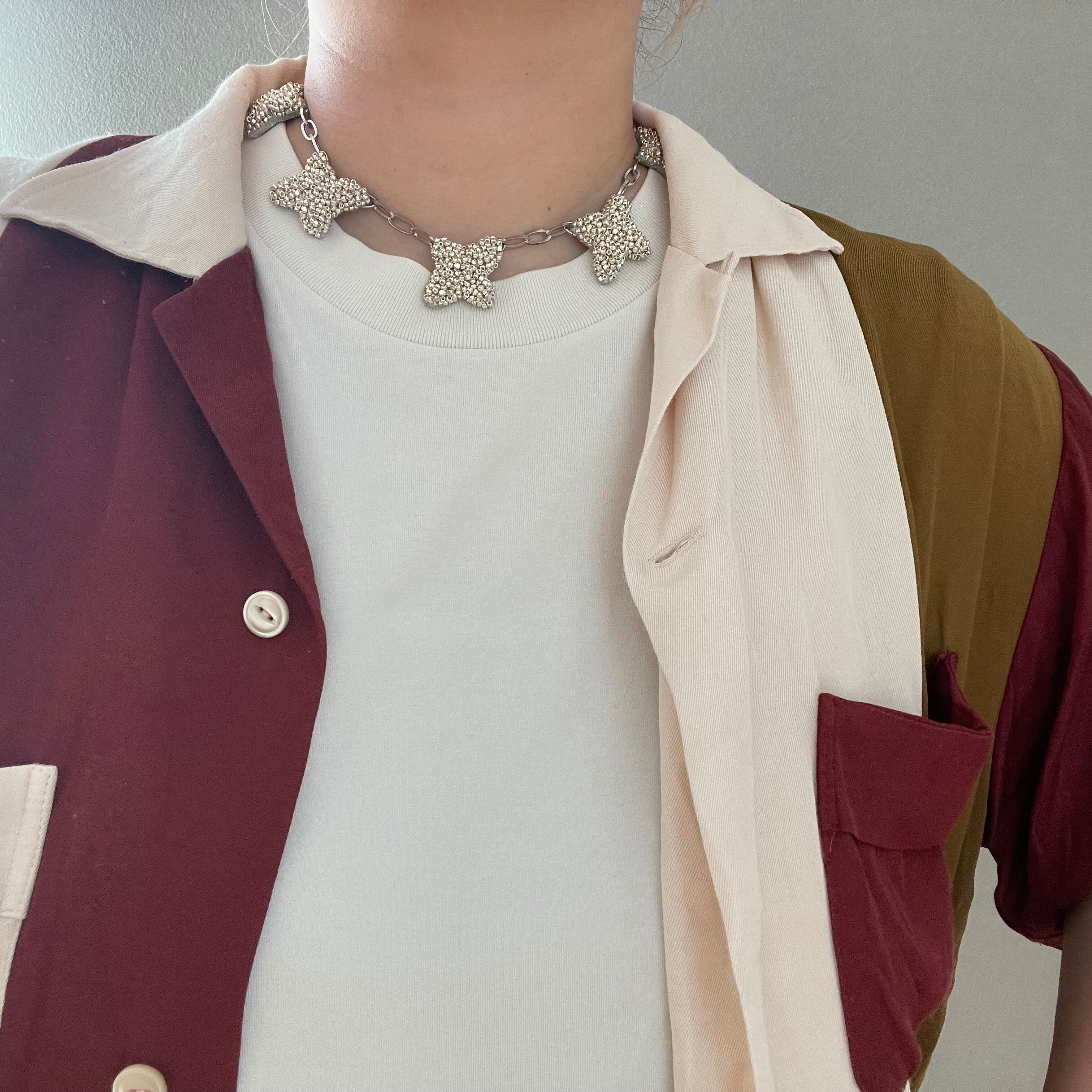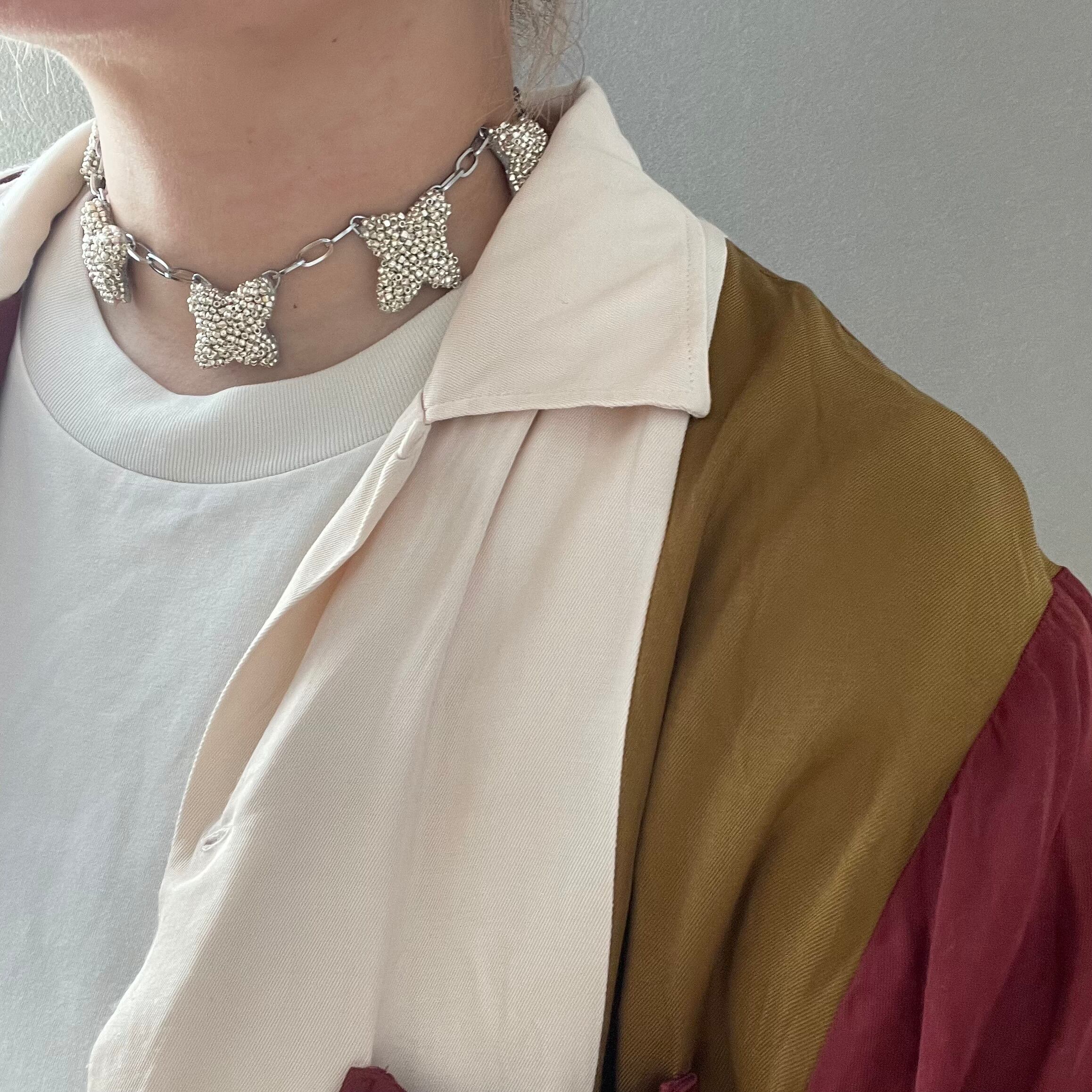 ランダムにバランスを見ながらビーズ刺繍を施したcrossモチーフをたくさん連ねたネックレス。