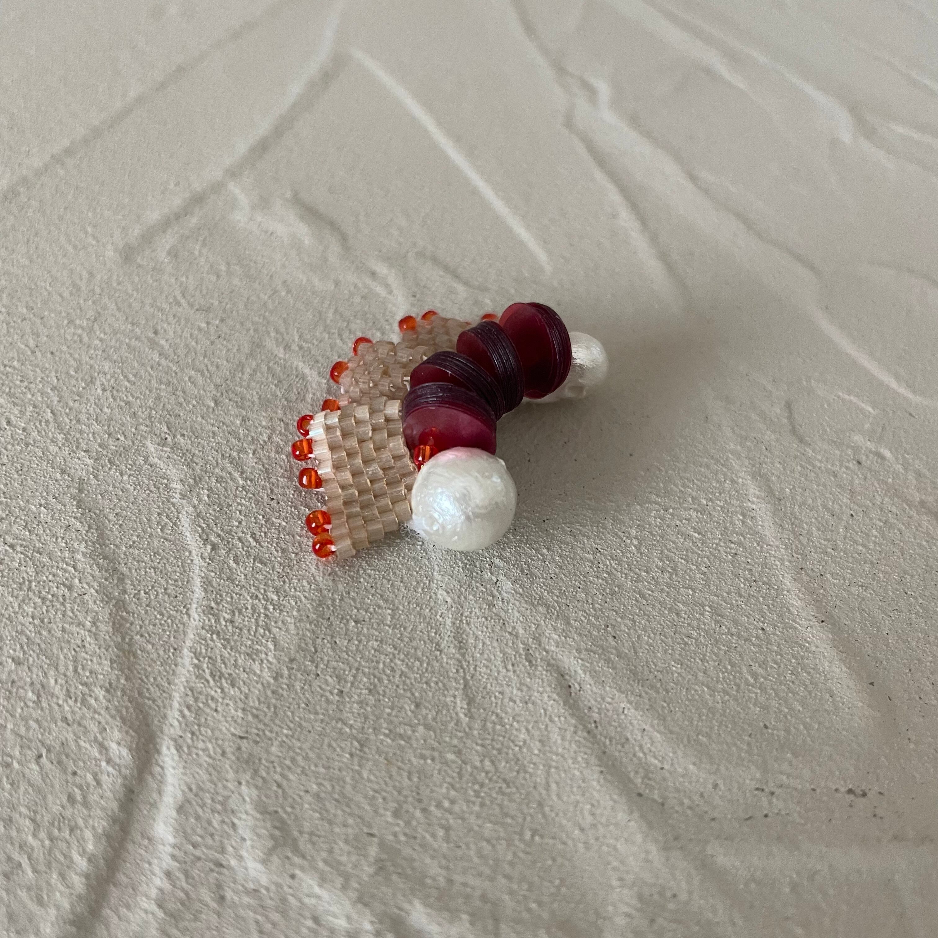 赤のシードビーズとブドウ色のスパンコールにグレージュのガラスビーズがキラキラと上品な組み合わせのデザイン。