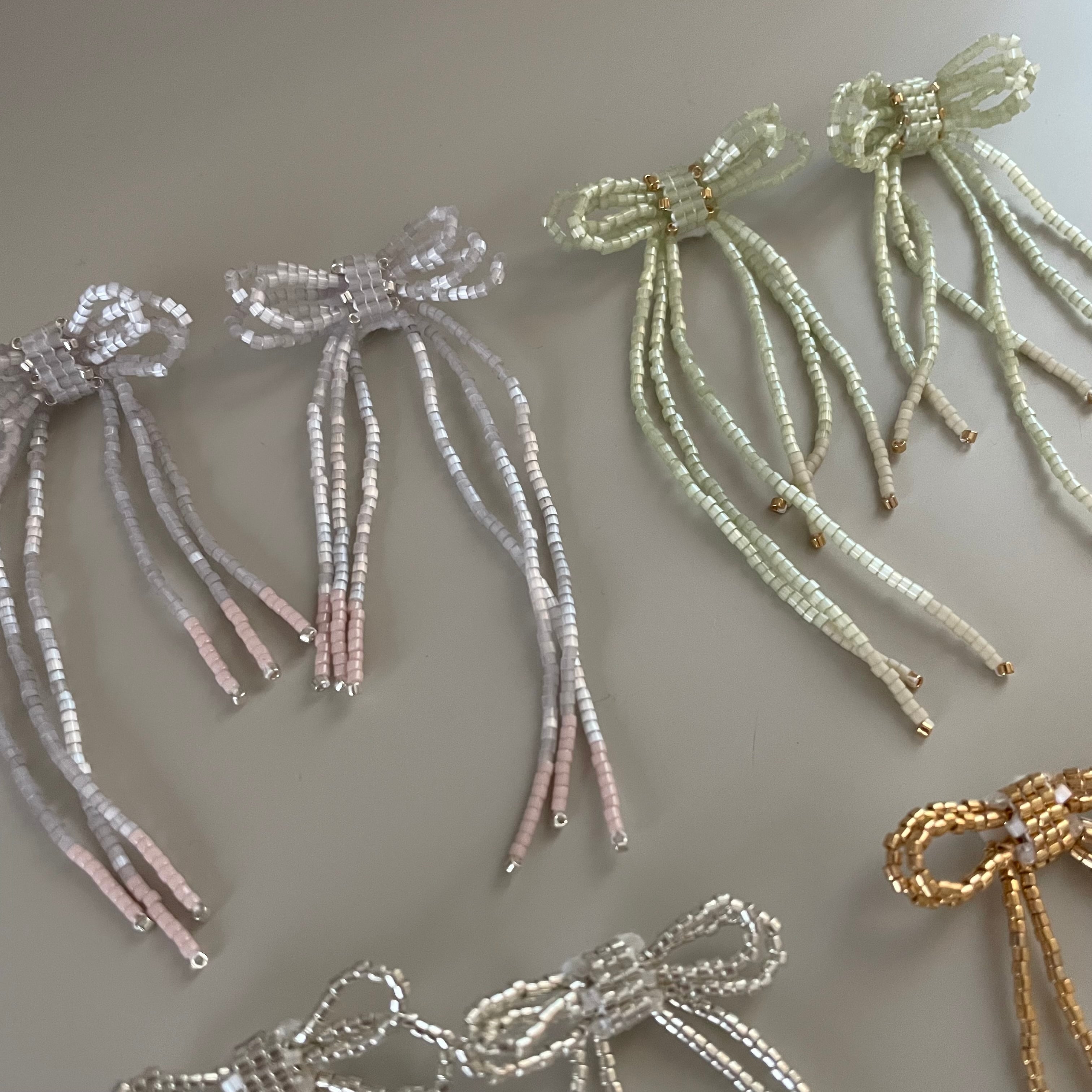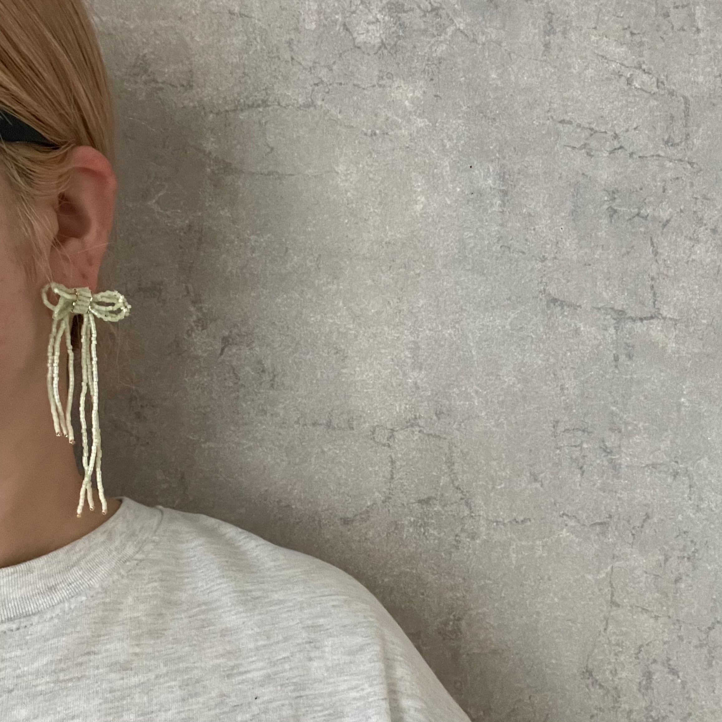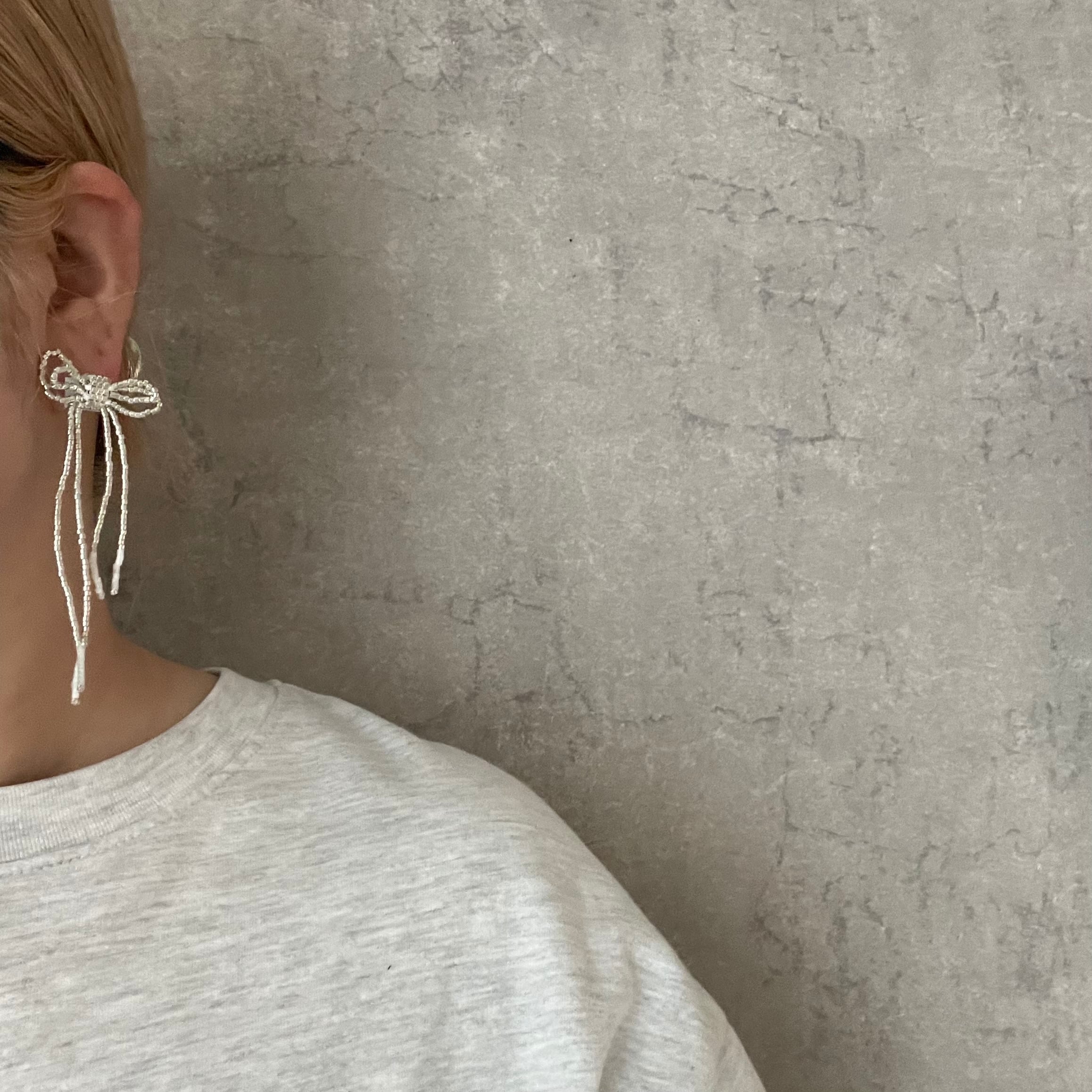 垂れてる部分はとことん長めにして左右長さを変える事で見た目に変化をだしつつリボン部分は短めの輪にして甘さ控えめに、結び目部分も1からビーズ編みをして作ったのでシンプルだけどとことん細部まで拘りを詰め込んだ耳飾りになっています。