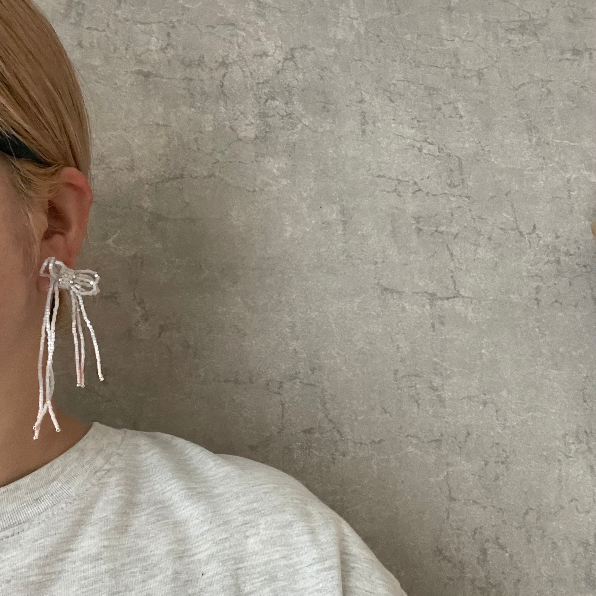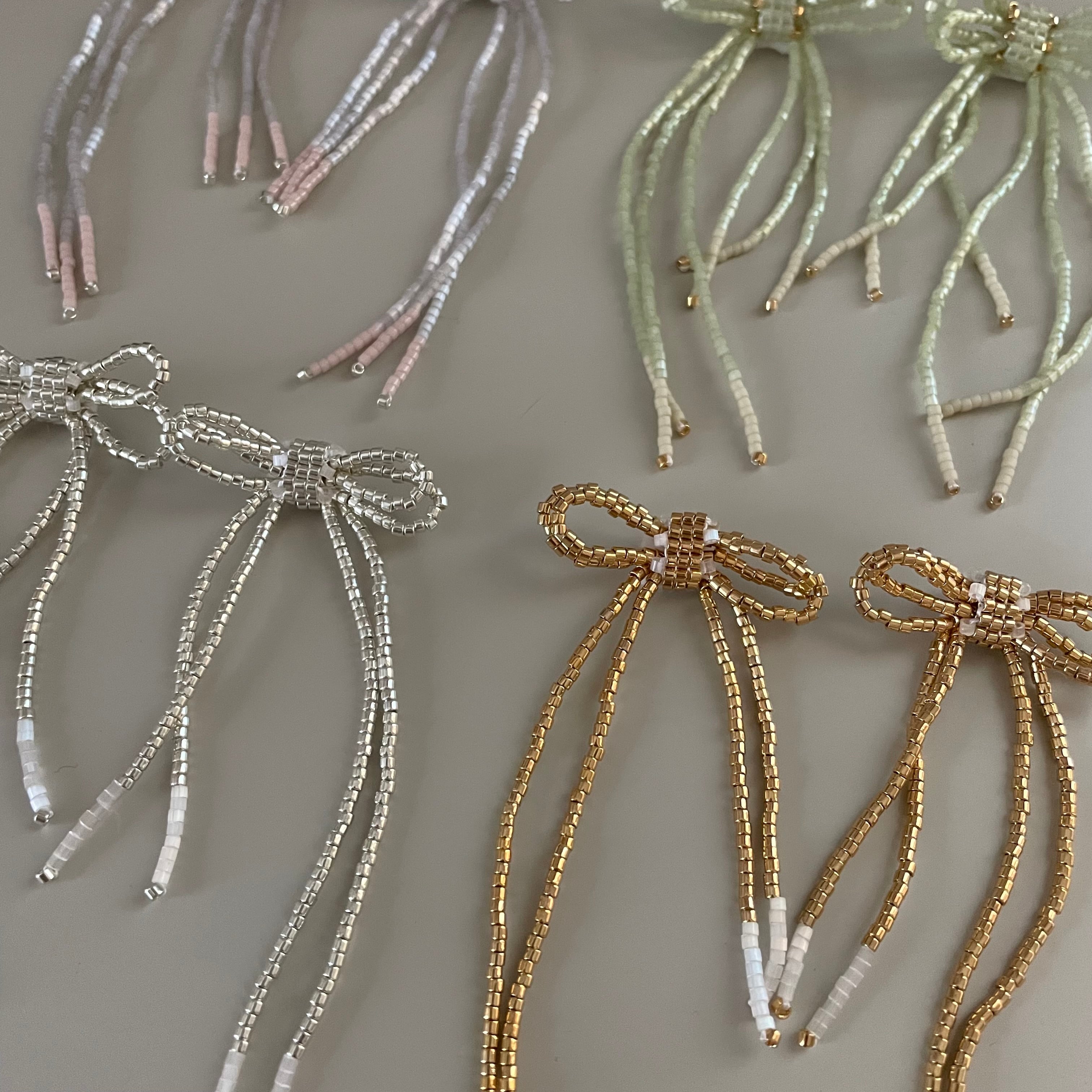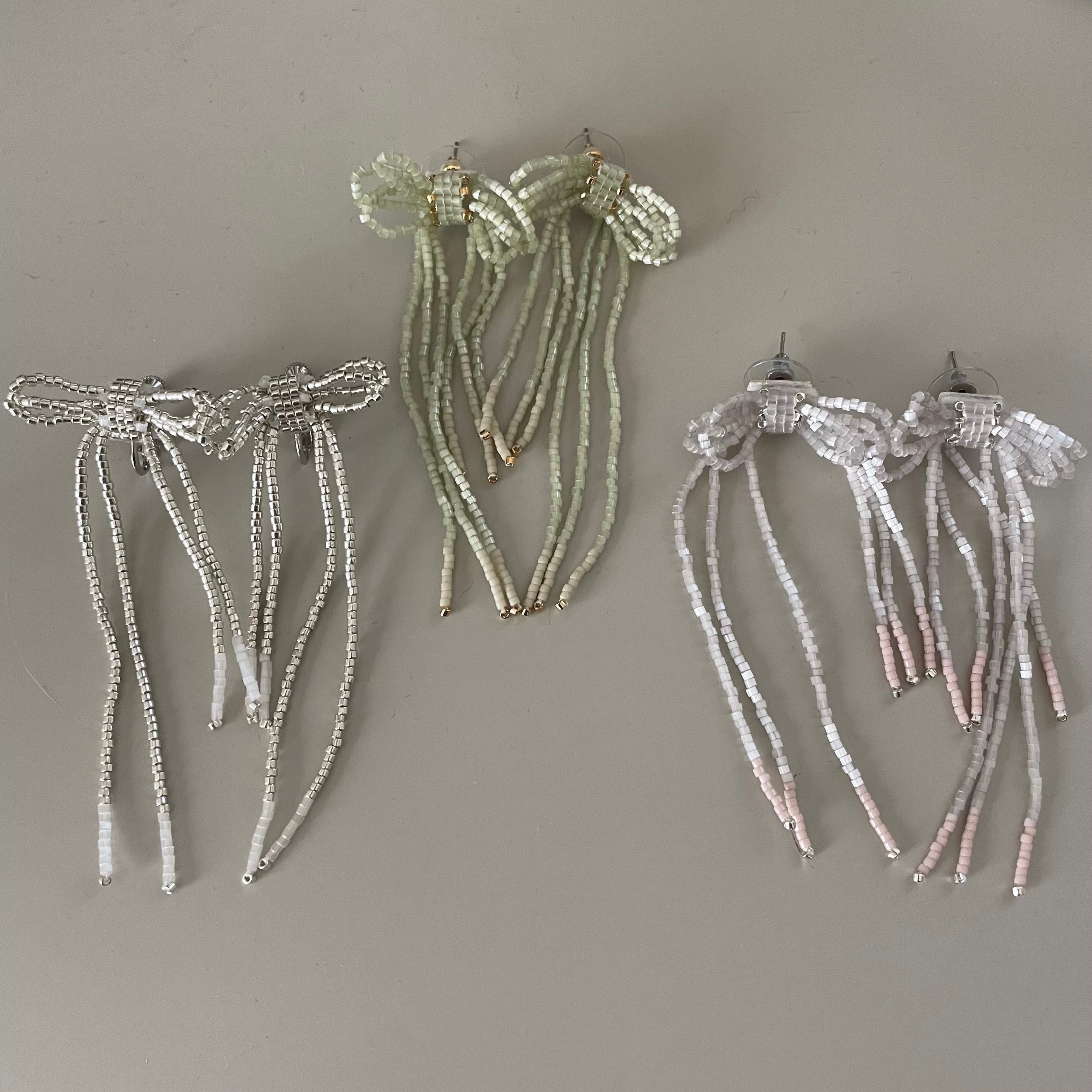 垂れてる部分はとことん長めにして左右長さを変える事で見た目に変化をだしつつリボン部分は短めの輪にして甘さ控えめに、結び目部分も1からビーズ編みをして作ったのでシンプルだけどとことん細部まで拘りを詰め込んだ耳飾りになっています。
