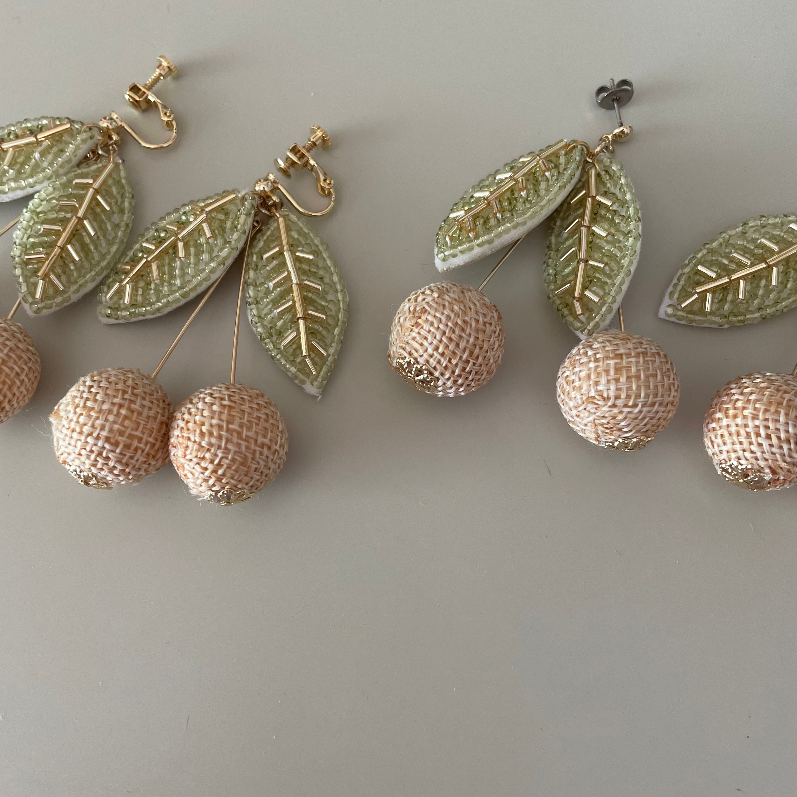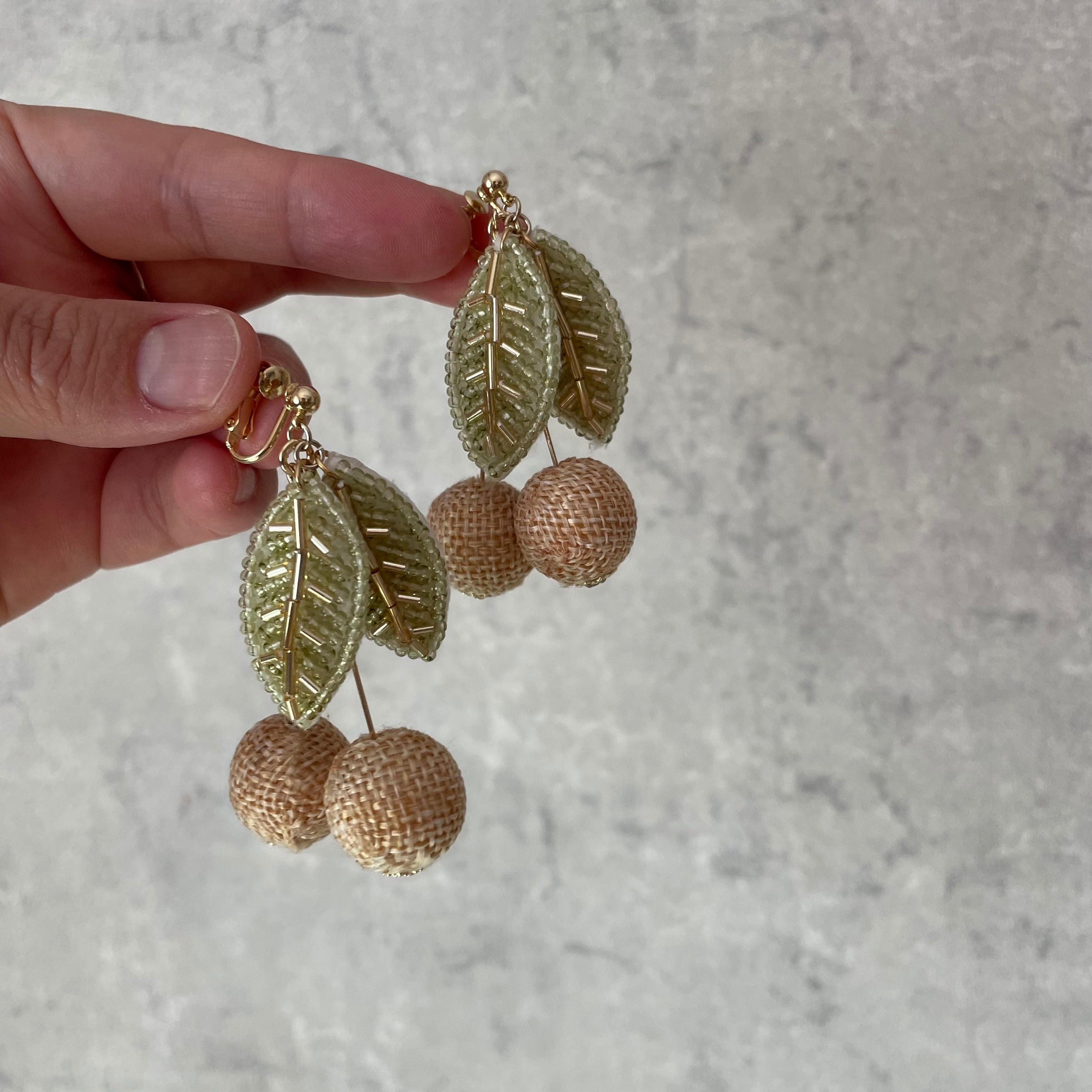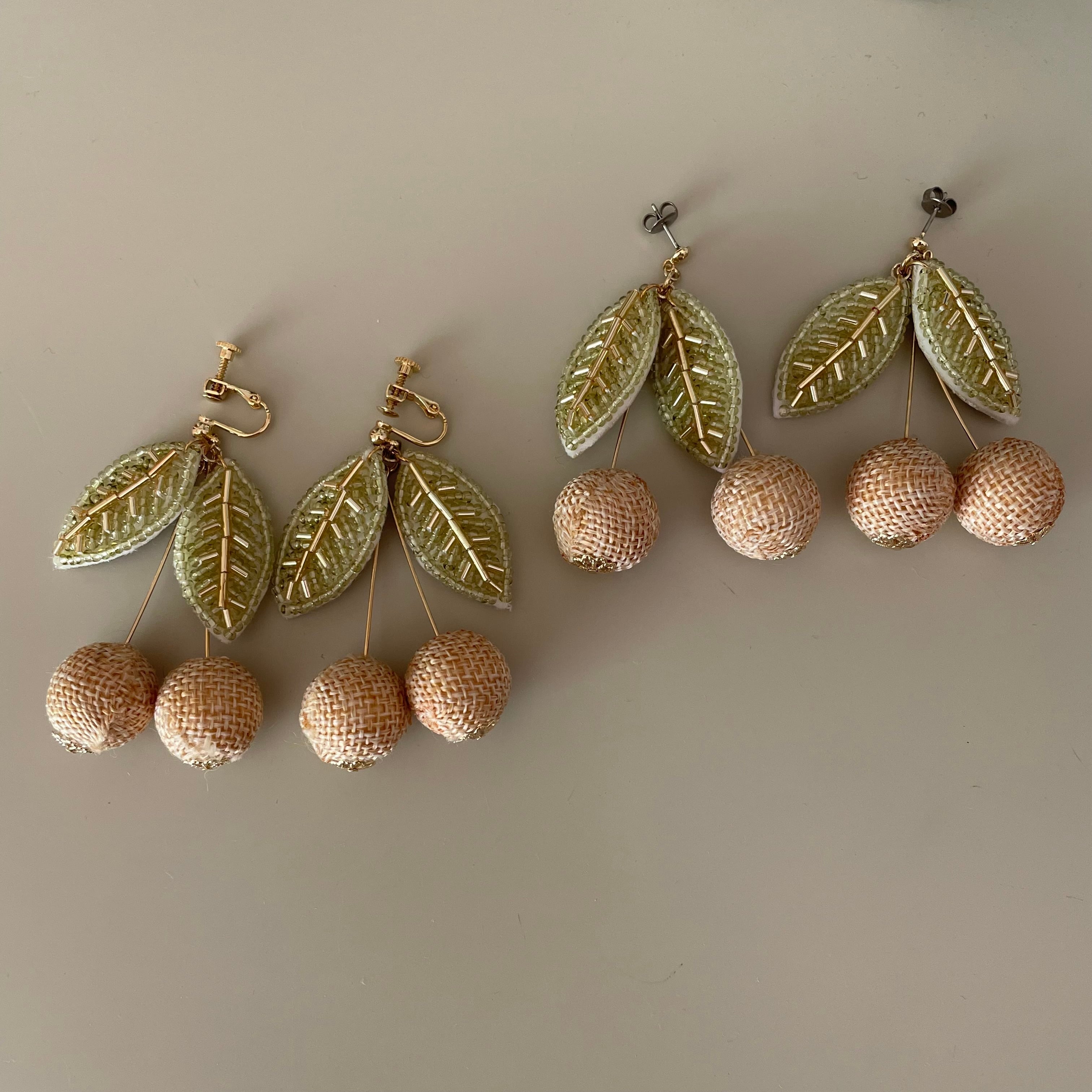 今回は実の部分は天然素材のラウンドパーツに変更して、以前よりも軽くてナチュラルな雰囲気のアクセサリーになりました。