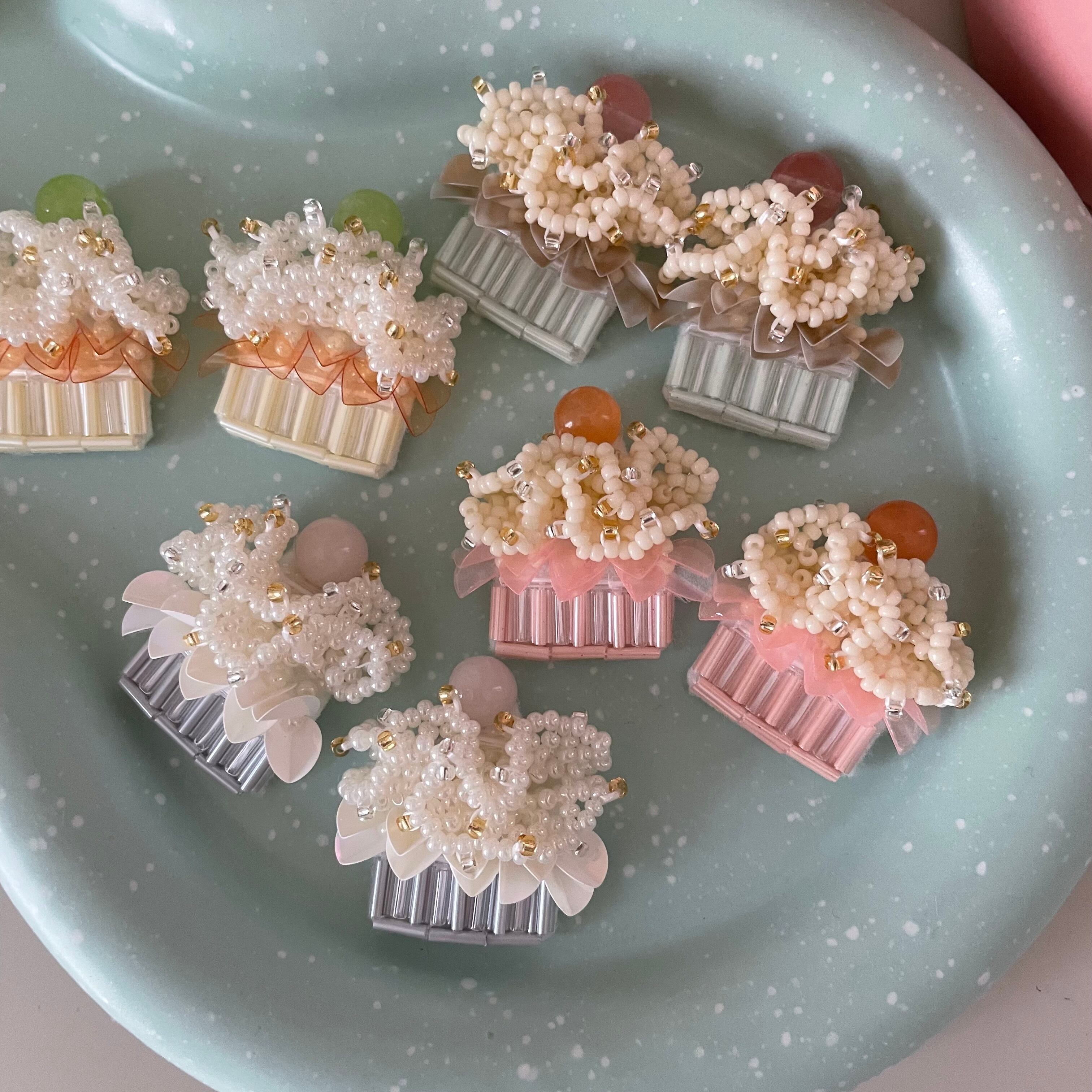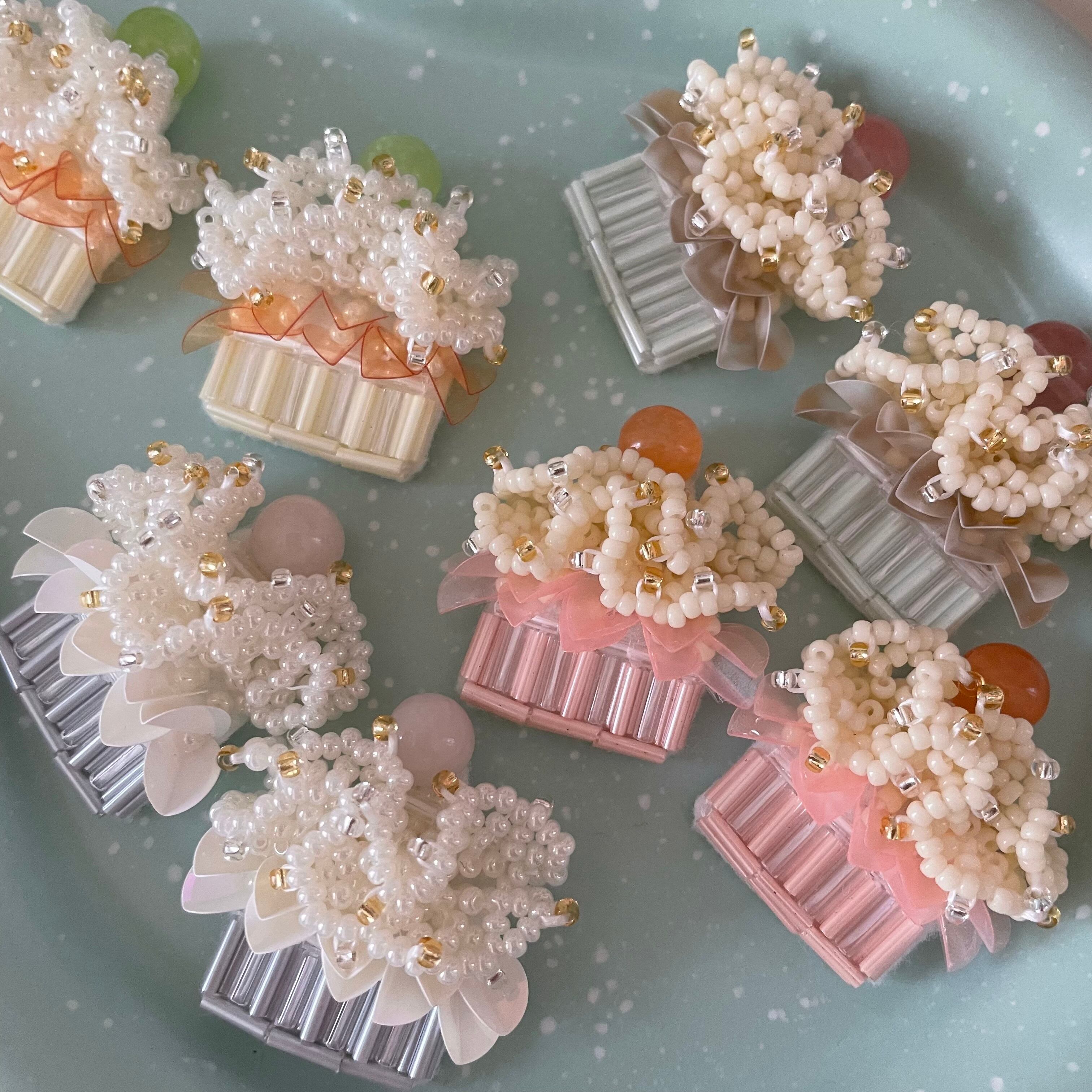 クリームの部分はビーズ編みで一粒ずつ編んで立体的なデザインになっています。